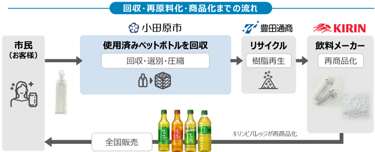 キリンビバレッジは、本協定の下、小田原市で回収された使用済みペットボトルが粉砕・洗浄などの工程を経て、リサイクラーである豊田通商にてリサイクルPET樹脂に再原料化されたものを、新たなペットボトルにリサイクルし当社の一部商品に使用します。本協定により、小田原市において排出される使用済みペットボトルのうち、年間約280tのペットボトルを水平リサイクルできる見込みです。また、市民へのペットボトルの分別回収に関する啓発活動にも取り組んでいきます。