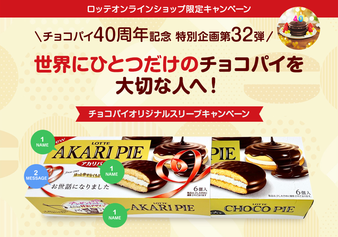 株式会社ロッテは、発売40周年を迎えるロングセラーブランド「チョコパイ」のキャンペーンをロッテグループ公式オンラインモール限定で開催します。世界で一つだけの名前入りチョコパイ(※)が40名様に当たります。