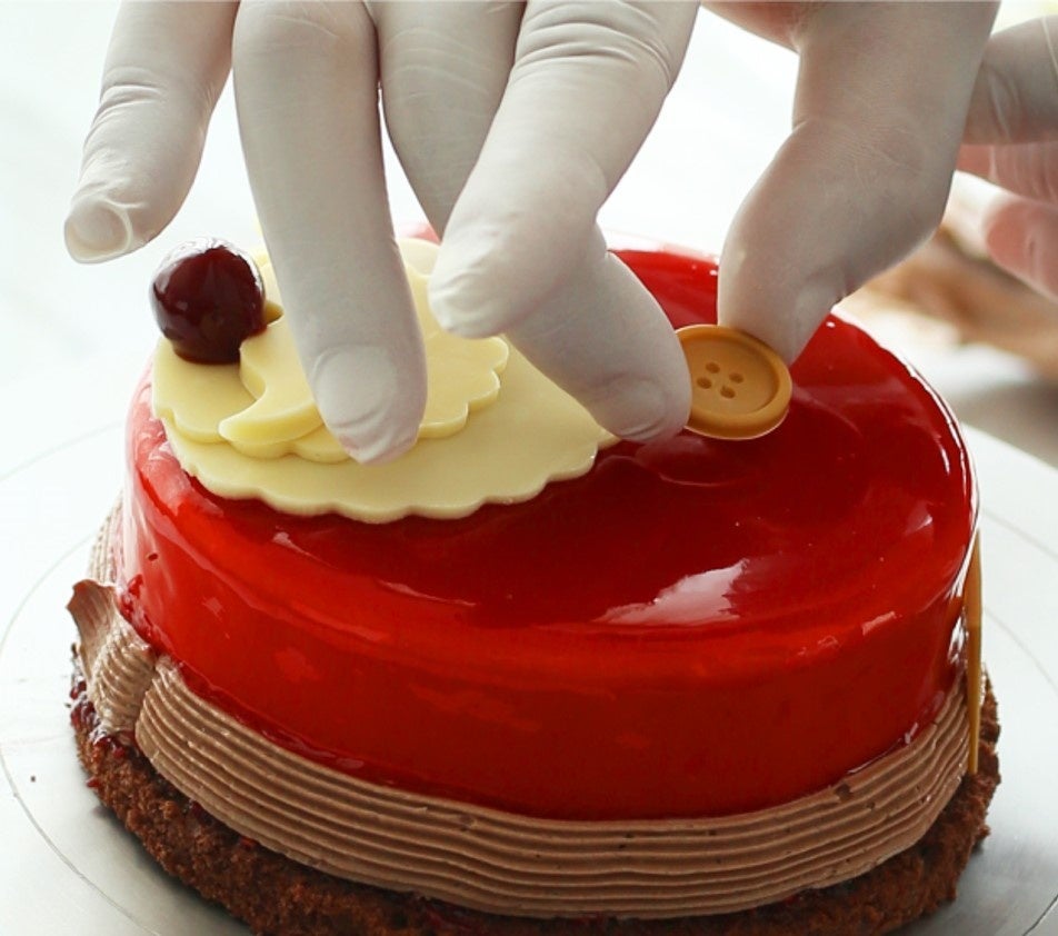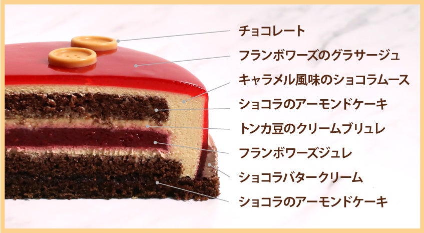 フランボワーズのグラサージュで、ほんのりキャラメル風味のショコラムースと、バニラのような甘い香りのスパイス「トンカ豆」の風味をとじ込めたまろやかな口どけのブリュレ、きりっとした酸味のフランボワーズのジュレを包みました。