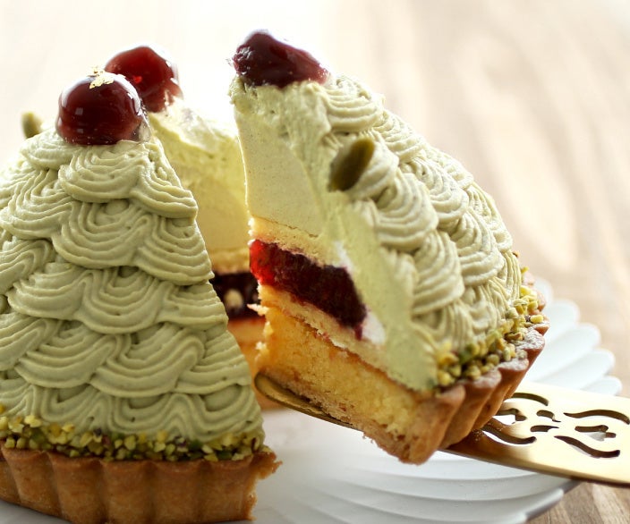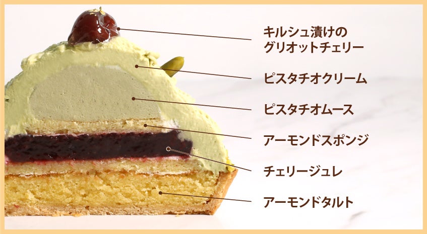 二年に一度の収穫のため希少性が高く、色鮮やかな見た目から「緑の宝石」とも言われているイタリアブロンテ産のピスタチオを使用。 その希少なピスタチオを使用したなめらかなムースを香ばしいアーモンドタルトにのせ、更にピスタチオクリームをもみの木をイメージした形に絞り上げました。 口どけ濃厚で風味豊かなピスタチオに合わせるのは、爽やかな香りと甘酸っぱさが特徴のチェリーのジュレ。この時期だけの贅沢な味わいをお楽しみください。