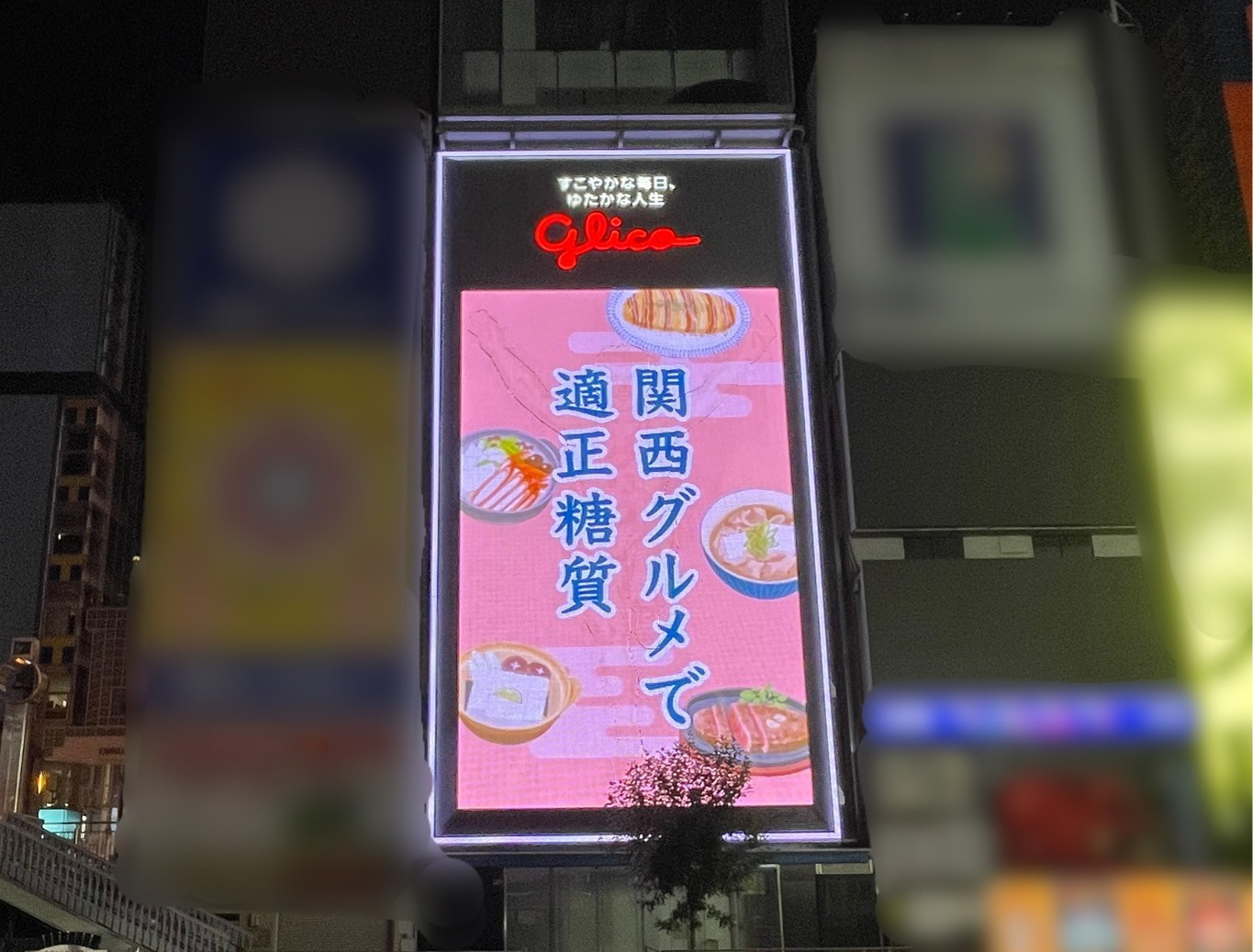 日本政府観光局(JNTO)の統計によると、2023年9月の訪日外国人は約218万人と、新型コロナウイルス拡大前に迫る水準に回復しています。大阪の代表的な観光スポット、「道頓堀グリコサイン」において、夜間点灯時に「適正糖質」の特別仕様に変更してメッセージを掲げます。
