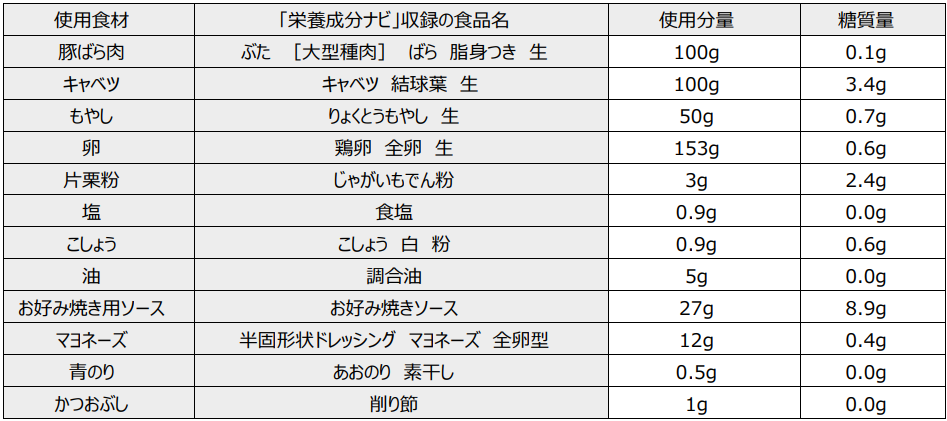 道頓堀グリコサインで使用している関西グルメの糖質量は、管理栄養士監修のもとで、下記の具材や調味料の分量に基づき、1人前あたりの糖質量を算出しています。(各メニューに使用している具材などは、地域やご家庭、提供される飲食店によって異なります。)