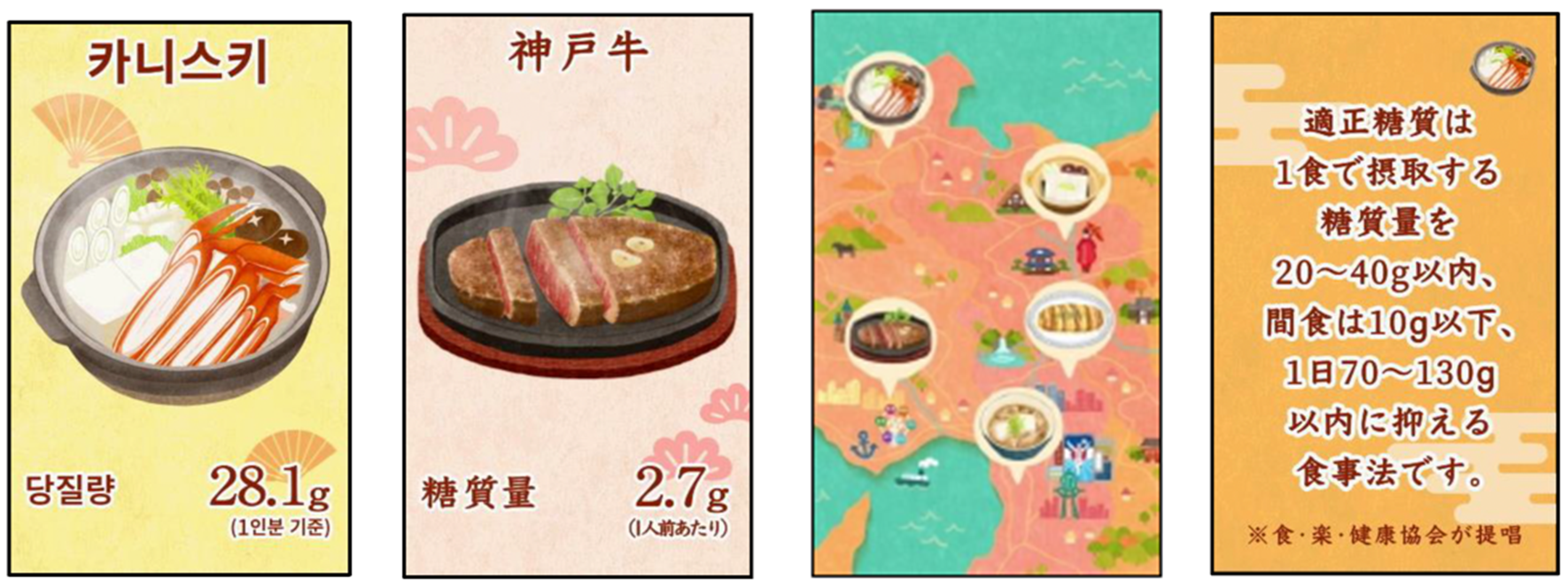具体的には、関西エリアのグルメの中で、代表的な5種類のメニュー「肉吸い」「とん平焼き」「湯豆腐」「かにすき」「神戸牛」について、それぞれ1人前の糖質量※3を紹介します。さらに、「適正糖質は、1食で摂取する糖質量を20~40g以内、間食では10g以下、1日70〜130g以内に抑える食事法です。※食・楽・健康協会が提唱」「グリコは糖尿病予防を推進しています。」といったメッセージを掲出します。日本語・英語・中国語・韓国語の多言語で表示することで、国内外の方々に広く「適正糖質」の考え方を伝えます。また、動画の最後には、大阪府広報担当副知事もずやんが登場し、健活10〈ケンカツ テン〉※4をPRします。