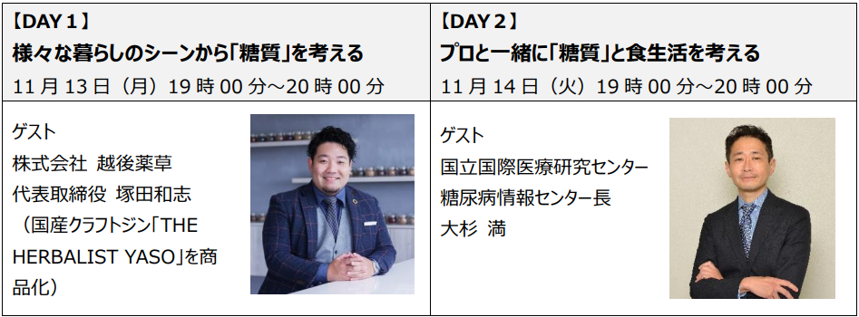 カジュアルなトークセッションで糖質や糖尿病について学ぶ「糖質について考えるナイト」を実施します。2日間にわたりゲストを迎えて、普段の食生活を見直すきっかけになるセミナーです。