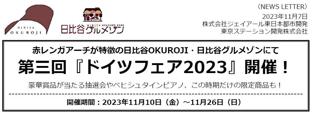 株式会社ジェイアール東日本都市開発と東京ステーション開発株式会社は、運営する日比谷OKUROJI・日比谷グルメゾンにて、2023年11月10日~26日の期間、第三回『ドイツフェア2023』を開催します。