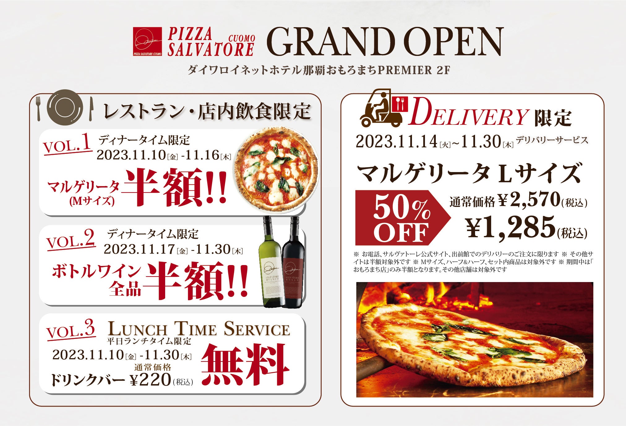 ァトーレ・クオモがプロデュースする⼤⼈気のピッツェリア 。『PIZZA SALVATORE CUOMO おもろまち』は、[沖縄県那覇市おもろまち4-2-14ダイワロイネットホテル那覇おもろまちPREMIER 2F] に位置し、11⽉10⽇(金) にグランドオープンを迎えます。ナポリピッツァ世界⼤会で3年連続⼊賞するなど、世界No.1を受賞した⾃慢のナポリピッツァはもちろん、ホテル内への出店ということもあり朝⾷からディナーまで楽しめる空間を提供いたします。季節を感じる本格イタリアンの⼀⽫、アペリティフにぴったりなアンティパストの⼩⽫料理まで豊富なメニューのラインナップをご⽤意いたしました。さらにデリバリーも対応するので、近隣のご⾃宅やオフィスでもクオリティの⾼い本物のナポリピッツァをご堪能いただけます。