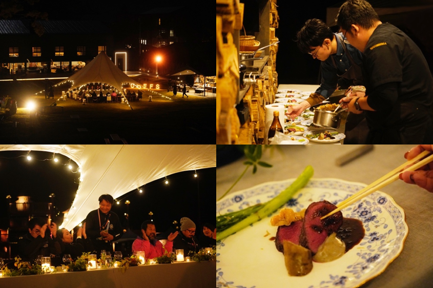 夜には両日とも、ワイン生産者とともにテーブルを囲むプレミアムなディナーを開催しました。シェフは世界的レストランガイドブック「ゴ・エ・ミヨ」掲載シェフである豊島雅也氏(TOYOSHIMA・山梨)と鈴木琢氏(aru・愛知)がつとめ、2日間限りの特別な空間をしつらえました。このディナーは今年4月に香川県を舞台に開催した「シェフズコラボレーションダイニング」の第2弾でもあります。山梨県内ワイナリー7社から至極のワインをセレクトし、通常は料理に合わせてワインをペアリングしていくのに対し、今回はワインに合わせてスペシャリテを提供していくという趣向で、料理の合間には各ワイナリーが醸造のストーリーや裏話を紹介するなど、ワイナリーとシェフがともに主役となる特別な会となりました。参加者からは山梨ワインや食材の美味しさへの驚きの声があがり、参加者同士の交流も弾んでいました。コースの最後には参加したワイナリーを代表して、「世界には美味しいワインがたくさんありますが、山梨のワインもまだまだ魅力的なワインがたくさんありますし、醸造の技術もあがっています。これからも山梨のワインをよろしくお願いします。」と挨拶があり、大きな歓声と拍手があがりました。