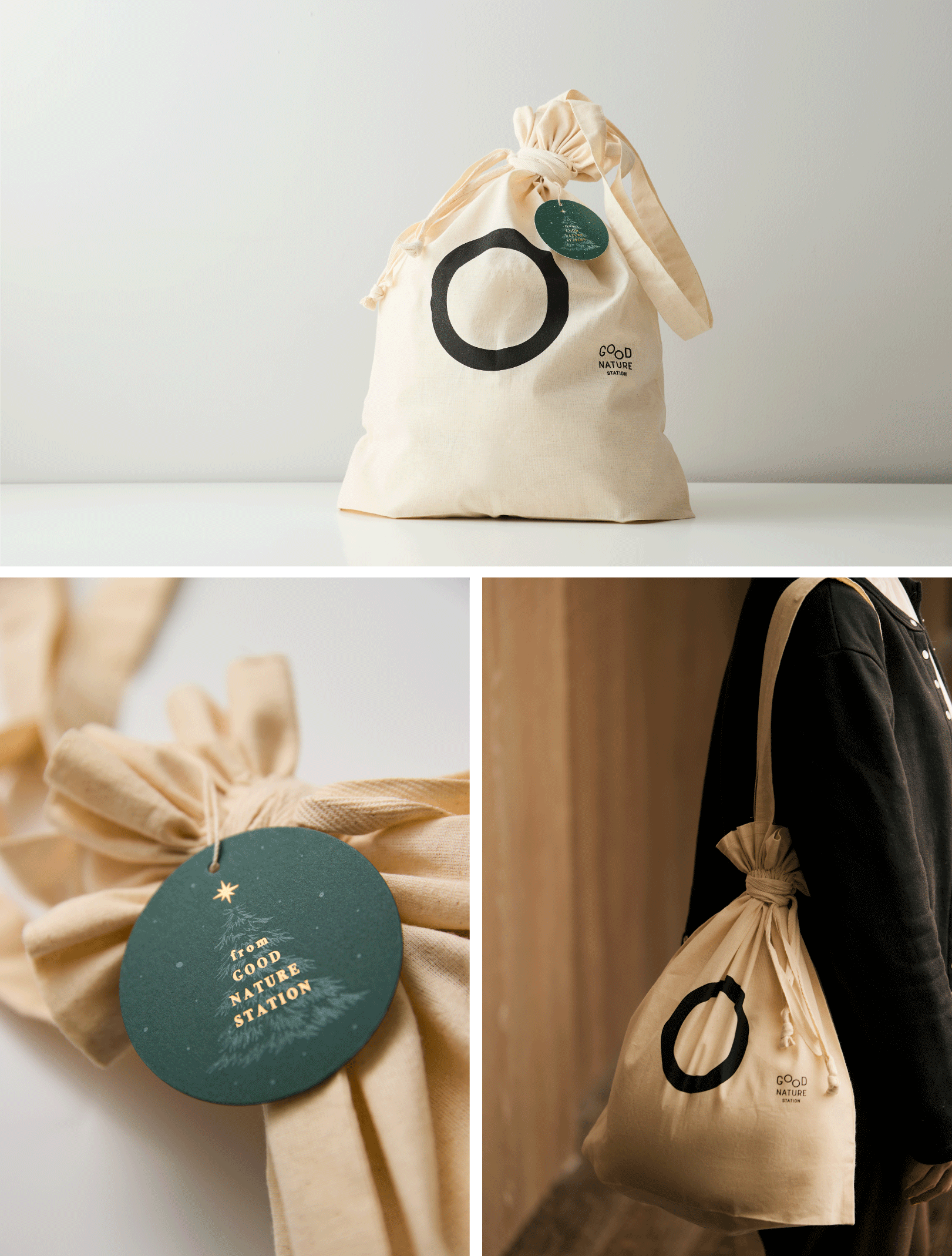 税込み3,000円以上お買い上げの方に、オリジナルの巾着トートバッグをプレゼント。素材はオーガニックコットン仕様で、オリジナルタグ付き。クリスマスラッピングとしても使用できます。