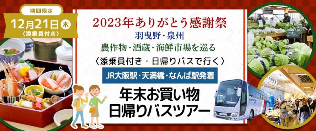 12月21日(木)おひとり様6,800円【羽曳野・泉州】〈大阪駅・天満橋・なんば発着・添乗員付き〉美味しい昼食&ワインナリー・農作物・酒蔵・漁協直営魚屋を巡る 2023年ありがとう感謝祭・お買い物ツアー日帰りバスツアーのオンライン販売を開始しました。