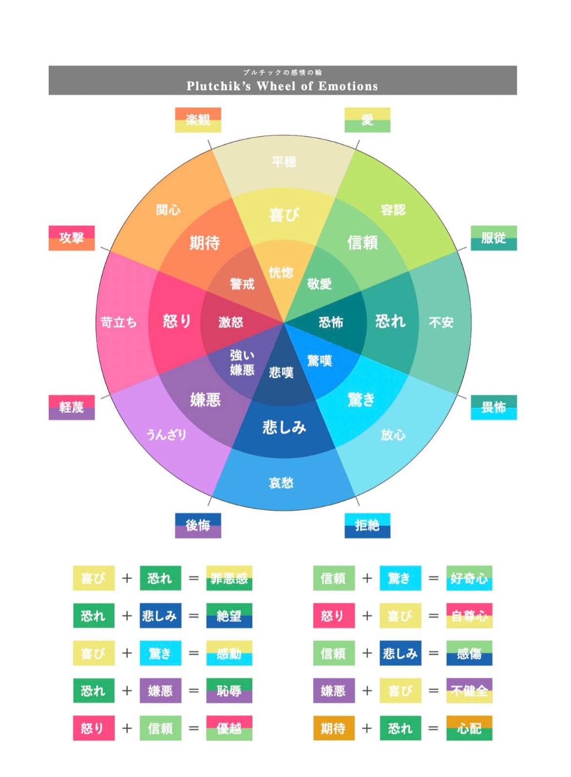 色が赤・青・黄といった原色を元にして、 その原色を混ぜ合わせることで、多種多様な色を生み出すことが出来るのと同様に、感情も基本となる感情同士が混ざり合うことで色々な感情が誕生すると提唱。そして、色相環のように感情を色彩によって分類したのが「プルチックの感情の輪」 です。