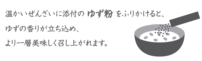 北海道産白小豆をすっきりとした上品な甘さが特徴の氷砂糖でじっくり丁寧に炊き上げた、こだわりのぜんざいです。温かいぜんざいにゆず粉を振りかけると、ゆずの香りが立ち込める。新しいぜんざいの楽しみ方です。