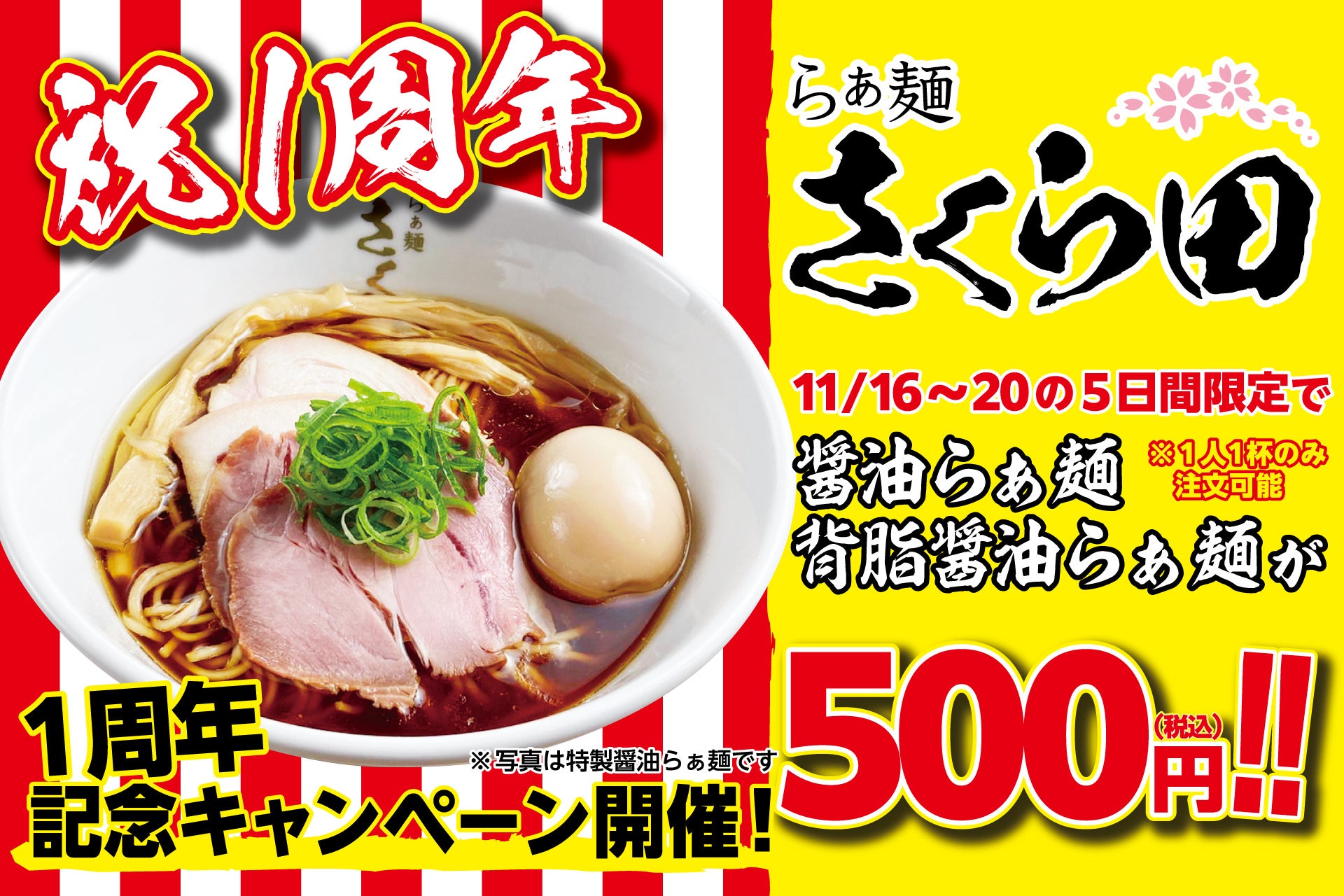 開店よりたくさんのご来店をいただいた1年分の感謝を込めて、看板メニューである「醤油らぁ麺」「背脂醤油らぁ麺」を、通常価格850円のところ【500円(税込)】でご提供いたします。