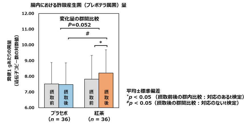 酢酸産生菌の1つであるプレボテラ属菌は、炭水化物(糖質や食物繊維)の摂取量が多い食生活の人の腸内でよく見られる腸内細菌であり、腸内で炭水化物を分解して短鎖脂肪酸を産生する能力が高いことが知られています。そのため、紅茶の飲用によるプレボテラ属菌の増加は、食事から摂取した未消化の炭水化物の利用を改善し、健康の維持増進に役立つ可能性があります。