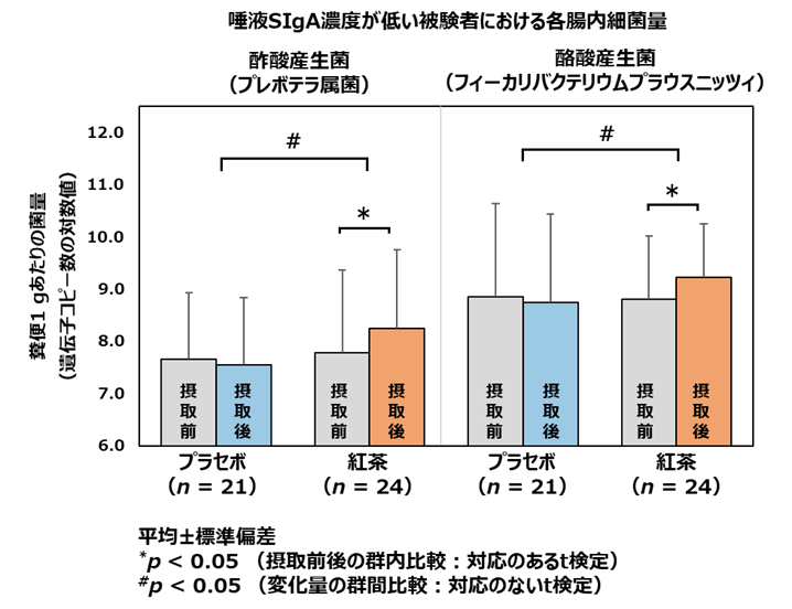 また、口腔内において粘膜免疫機能を担う免疫物質(唾液SIgA)濃度が低い人では、紅茶の飲用により唾液SIgA濃度が上昇することが分かっています1)。そこで、本研究でも同様に、唾液SIgA濃度が低い人を対象として、習慣的な紅茶飲用による腸内細菌叢への影響を検証しました。