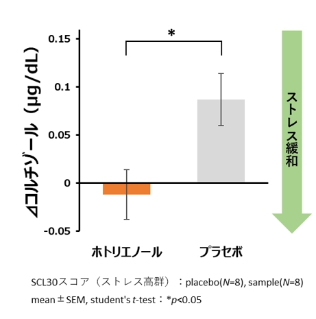3.ホトリエノール含有食品を単回摂取することで、非含有食品と比較して、日常生活のストレスによる免疫機能の低下を抑制することが明らかとなりました。また、オキシトシンを増加させ快適感を高めることが明らかとなりました。