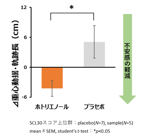 2.ホトリエノール含有食品を単回摂取することで、非含有食品と比較して、重心動揺(軌跡長)を減少させることが明らかとなり不安感を軽減していることが示唆されました。