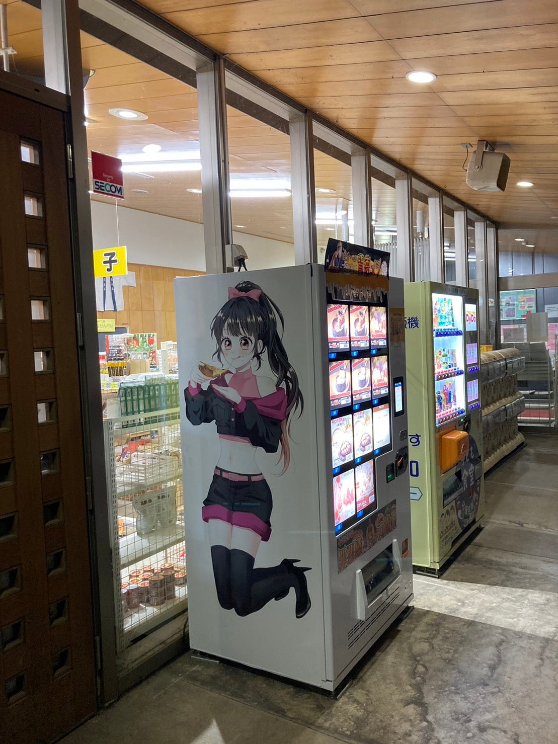 右の写真は、オーナー様のお知り合いの方が背徳メシを食べる少女をコンセプトにオリジナルで作成し、自販機にラッピングされております。とても可愛らしいので、商品のみならずこちらもぜひお楽しみください。