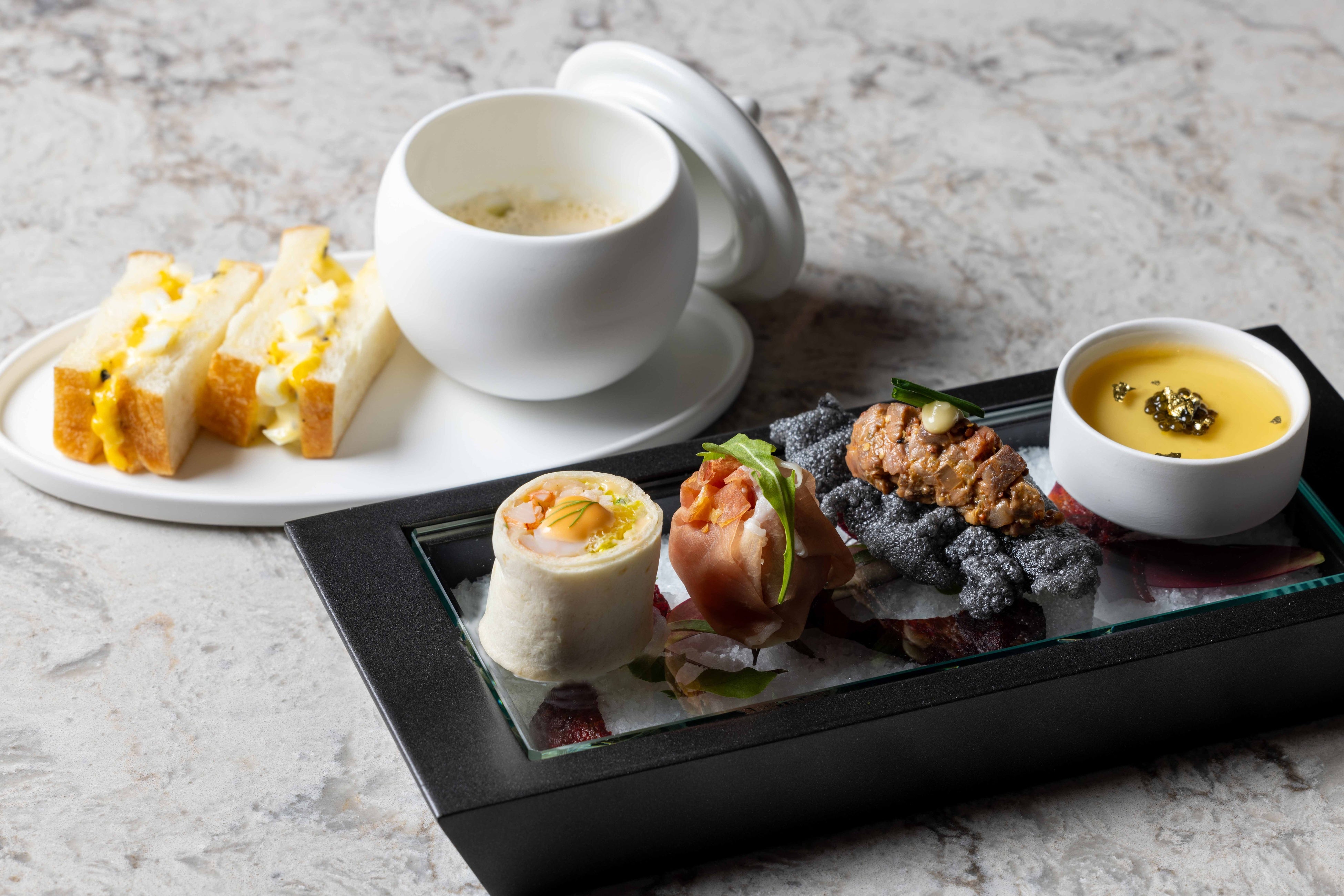 ラム酒や酒粕など、アルコールの香りを活かしたスイーツはオーナメントやヒイラギ、雪の結晶などのクリスマスらしいモチーフと色合いでドレスアップ。オマール海老やズワイガニなど冬の味覚を使用したセイボリーは、一品一品を繊細に仕上げ、心温まる温製のズワイガニのフランや滋味深いカブとコンソメジュレ キャビア添えなどメインバーらしいクオリティを味わえます。