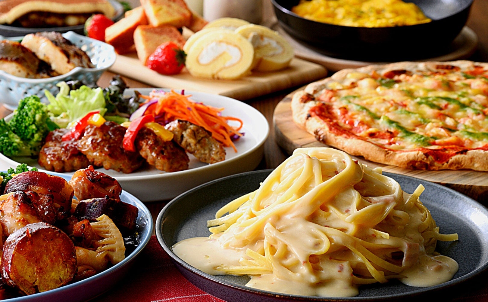 『グランブッフェ』では、店内仕込みでカラッとジューシーな『自家製から揚げ』や、トッピングなど自分好みの味でお召し上がりいただける『うどん』や『ラーメン』などの豊富な麺類。更に食後のデザートでは、セルフメイクで楽しめる『ソフトクリーム』など、魅力満載なメニューが勢ぞろい!