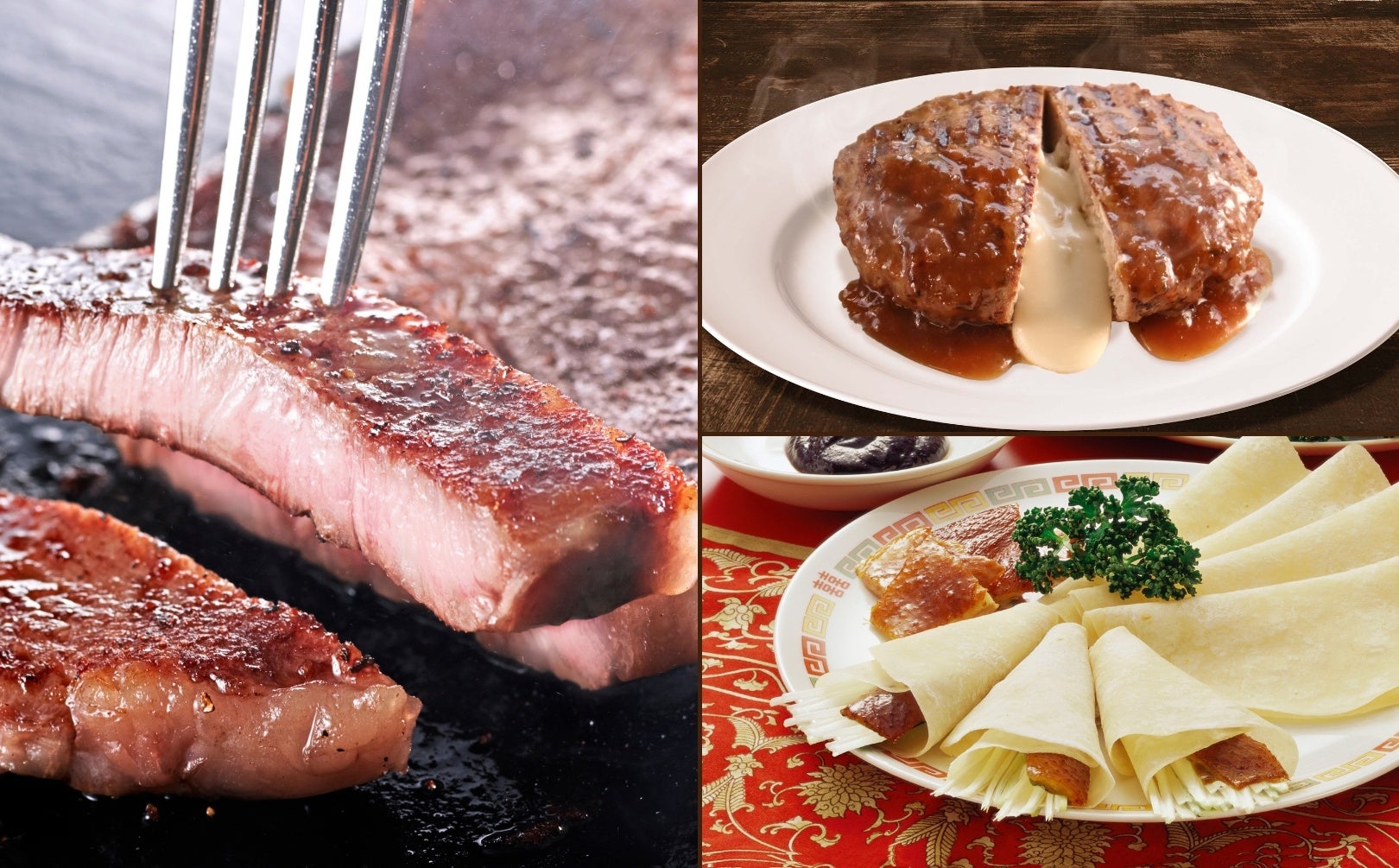 そして、プレミアムコースでは、飲茶以外にも、肉汁と10種類のブレンドした濃厚なチーズが溢れ出す『チーズインハンバーグ』や、『ビーフステーキ』などのグリルメニュー、肉厚ジューシーな『北京ダック』もすべて食べ放題!