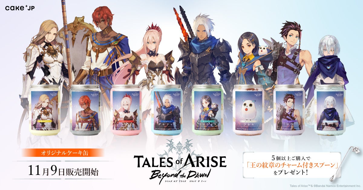株式会社バンダイナムコエンターテインメントから2023年11月9日(木)より配信・発売の「Tales of ARISE」のゲーム本編のエンディング後を描いた物語である、新規大型ダウンロードコンテンツ「Tales of ARISE – Beyond the Dawn(テイルズ オブ アライズ ビヨンド ザ ドーン)」とのコラボレーションオリジナルケーキ缶8種類を販売します。