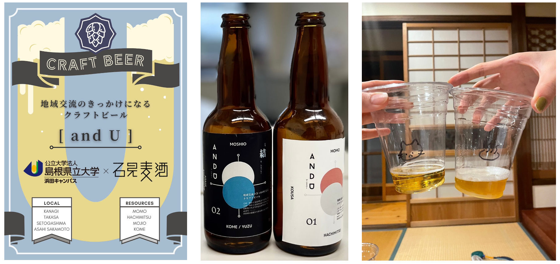 2023年10月29日(日)、島根県立大学の学生が石見麦酒と共同開発中のクラフトビールの試飲会が、浜田市内の飲食店”天水”で開催された。同大学のキャンパスが位置する浜田市の素材を副原料として使用した2種類のクラフトビールは、”結(むすび)”と、”香(かおり)”。クラフトビールの製造・販売を手がける島根県を代表するブリュワリー”石見麦酒”の協力のもと、今年の4月から始まったプロジェクトが半年の期間を経て形になった。副原料には浜田市で採れたコメ、桃、塩、ハチミツなどを使用している。コンセプトは”地域交流のきっかけになるクラフトビール”。学生が自分たちで原料調達や原価計算、ラベルデザインなどを手掛け、クラフトビールの製造工程も体験している。