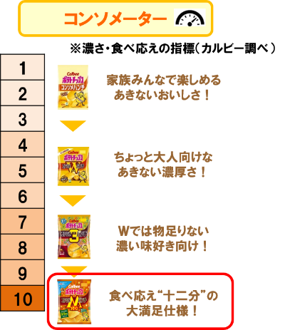 本商品は、11月で「ポテトチップス コンソメパンチ」が発売45周年を迎え、「ポテトチップス コンソメWパンチ」が発売20周年を迎えることを記念して発売する、特別な厚切りポテトチップスです。