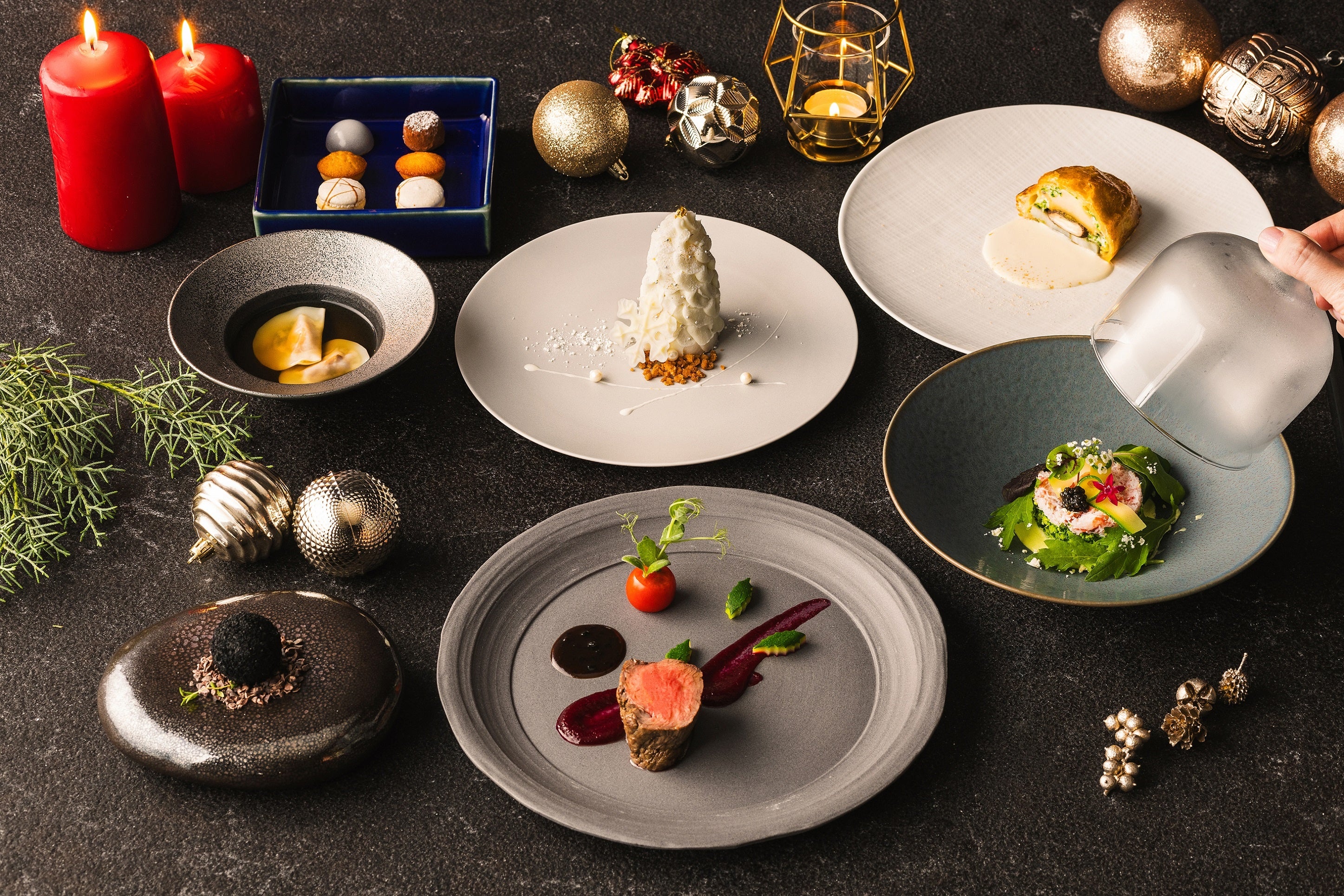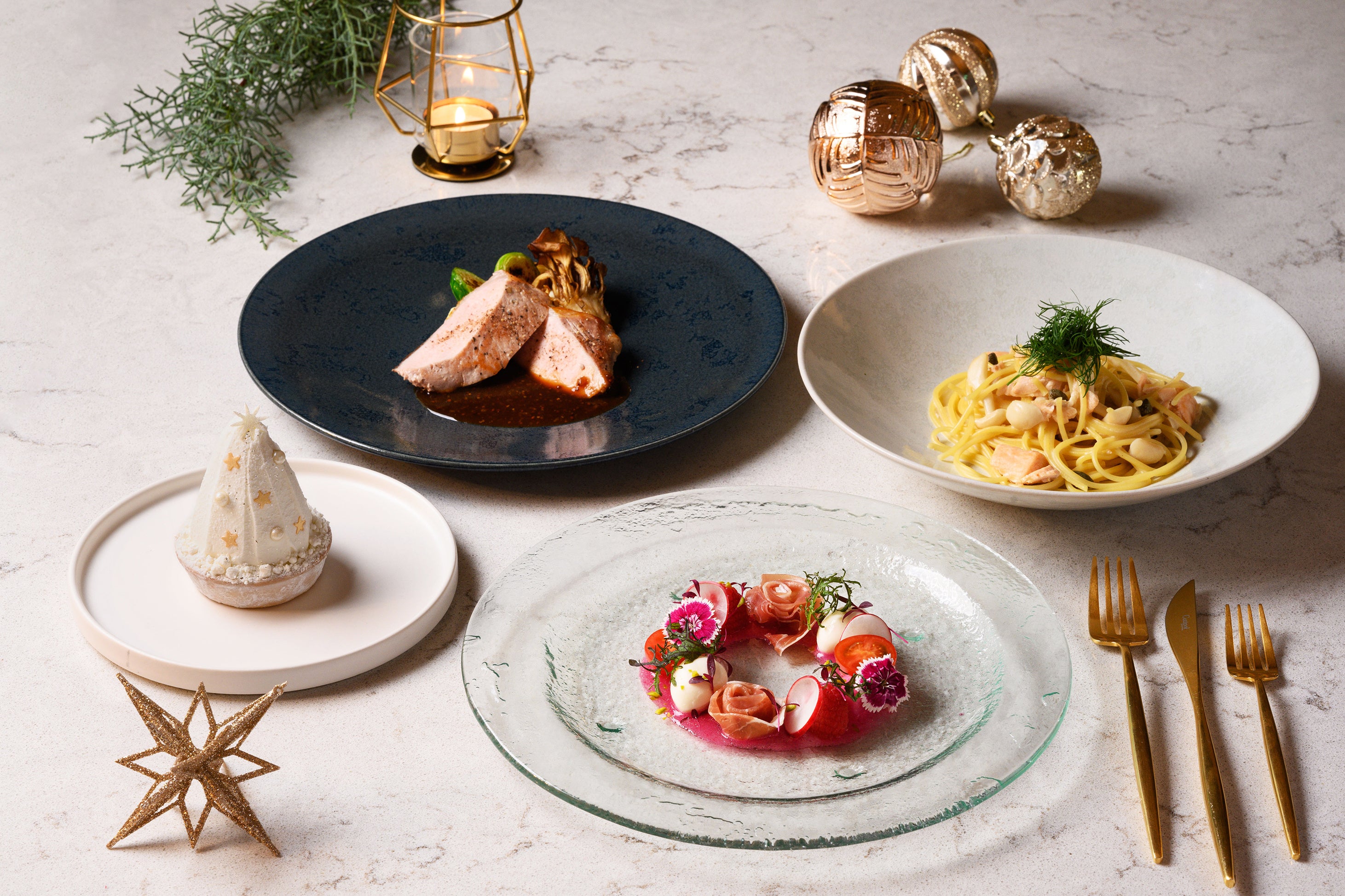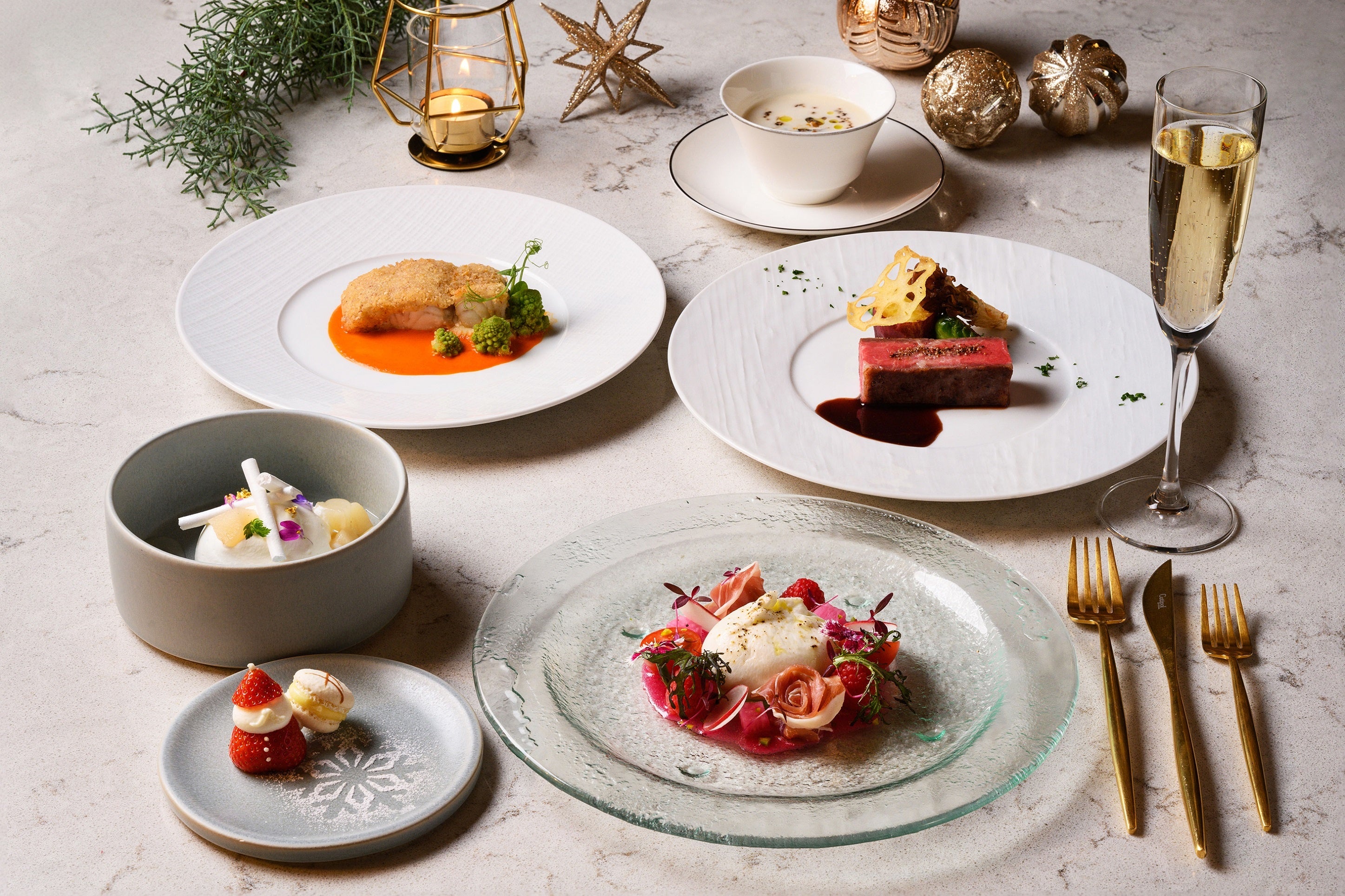 シェフ特製のホリデーシーズン限定コースをご提供いたします。旬の食材をふんだんに使用するとともに、ディナーのメインは国産牛サーロインが登場。クラシックな赤ワインソースと合わせて贅沢な味わいをご堪能いただけます。今年はサンタクロースやツリーをモチーフとした一目見ただけでクリスマスを感じられるデザートもご用意いたします。