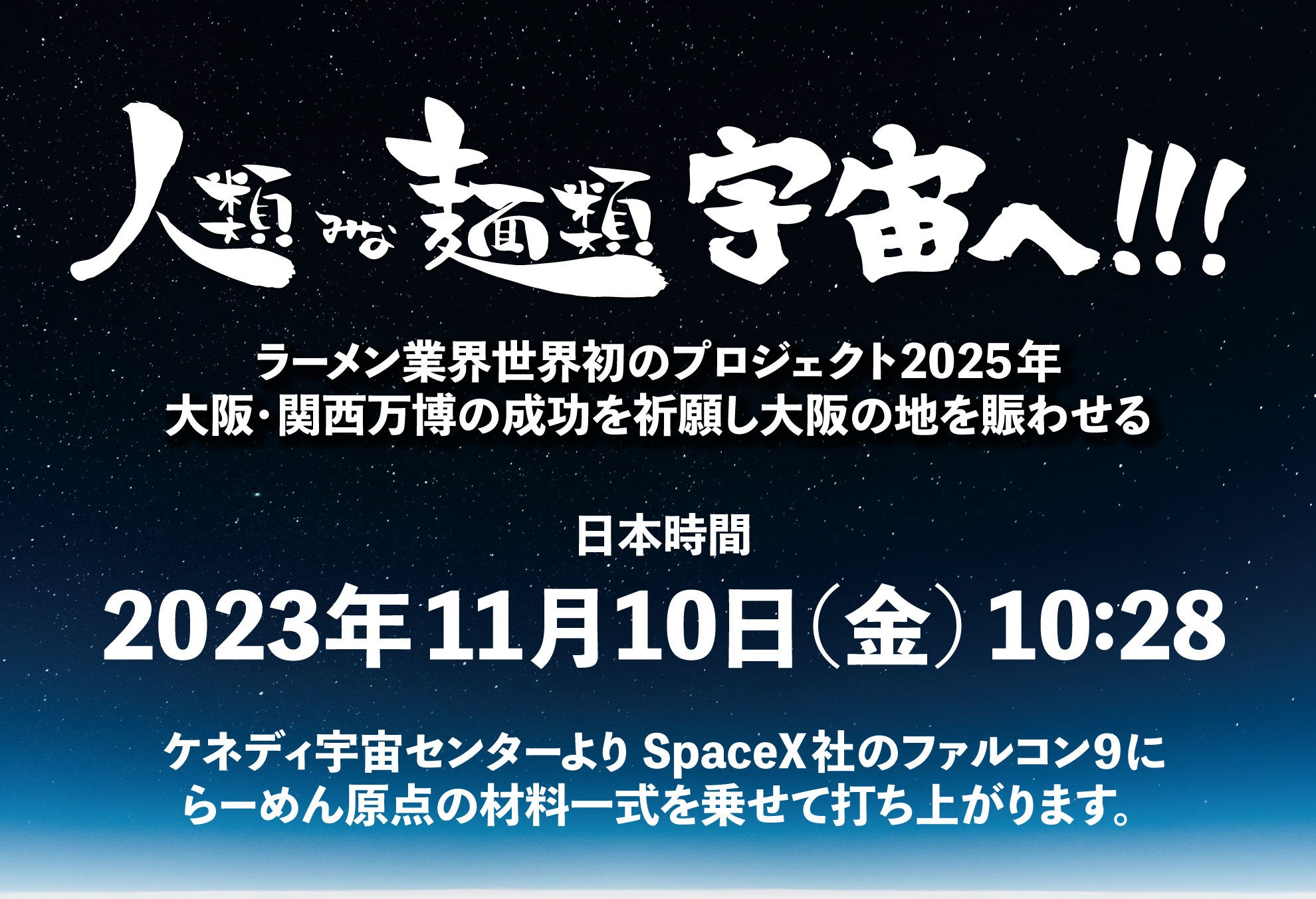 ⼤阪⾏列No.1ラーメン店「⼈類みな麺類(⼤阪・南⽅)」を運営するUNCHI株式会社(本社:⼤阪市淀川区、代表取締役:松村貴⼤)は、「ラーメン食材一式」などを搭載したイーロンマスク⽒率いるアメリカの航空宇宙メーカーSpaceX社の宇宙ロケット「Falcon 9」が11月10日に(※)に打ち上がることをお知らせいたします。