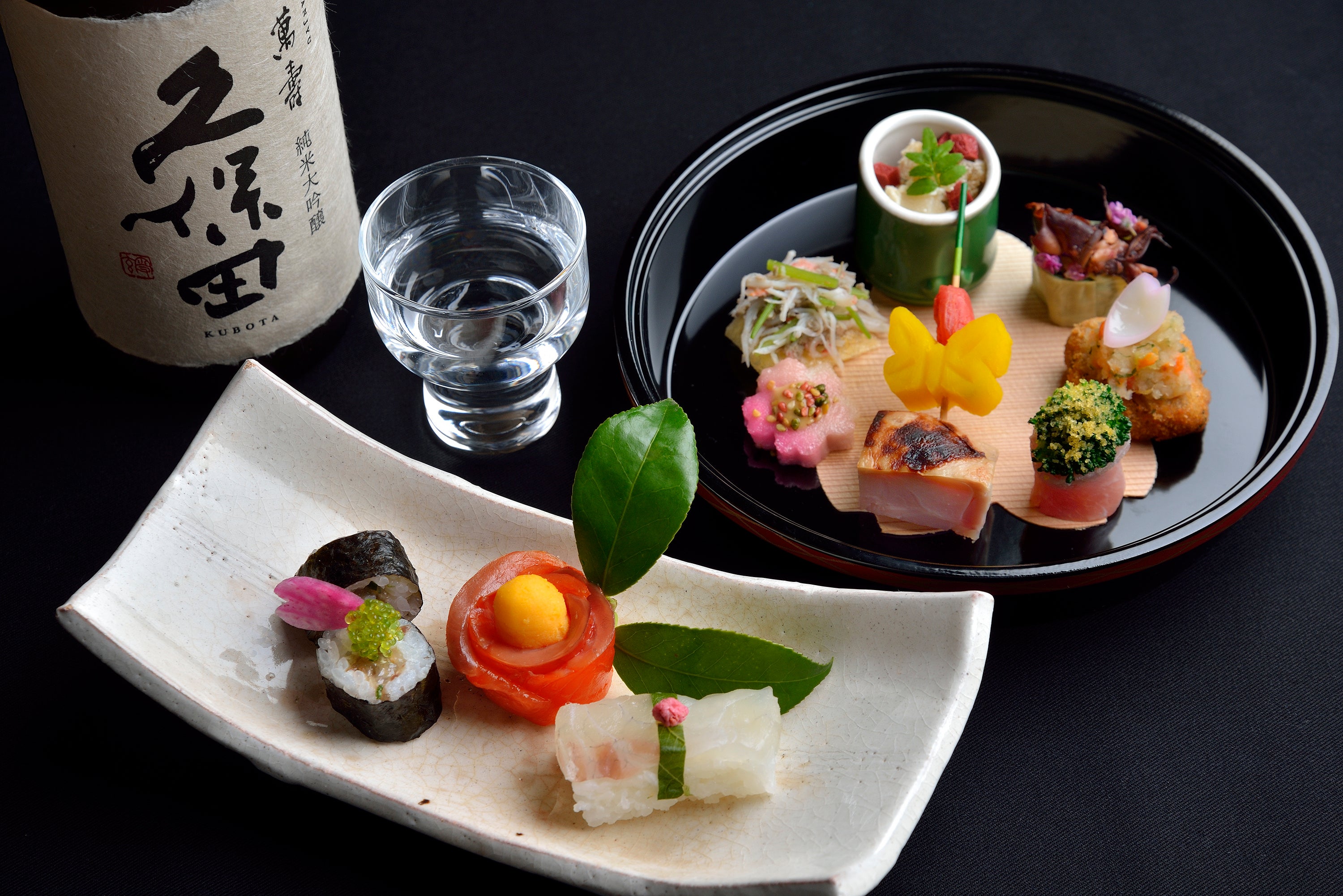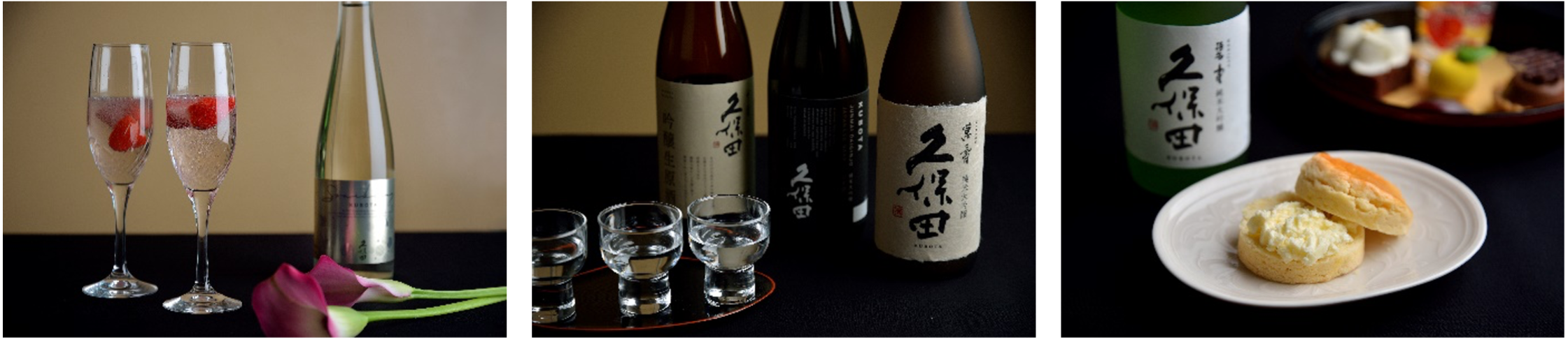 また、ウエルカムドリンクには、凍らせたイチゴを浮かべ、時間とともにピンクに移り変わる色も目で楽しめる「久保田スパークリング×フローズンストロベリー」をご用意。「久保田 萬寿」と「久保田 純米大吟醸」、「久保田 千寿 吟醸生原酒」の3種の利き酒セットは、スイーツやセイボリー、別皿とご一緒にお楽しみください。