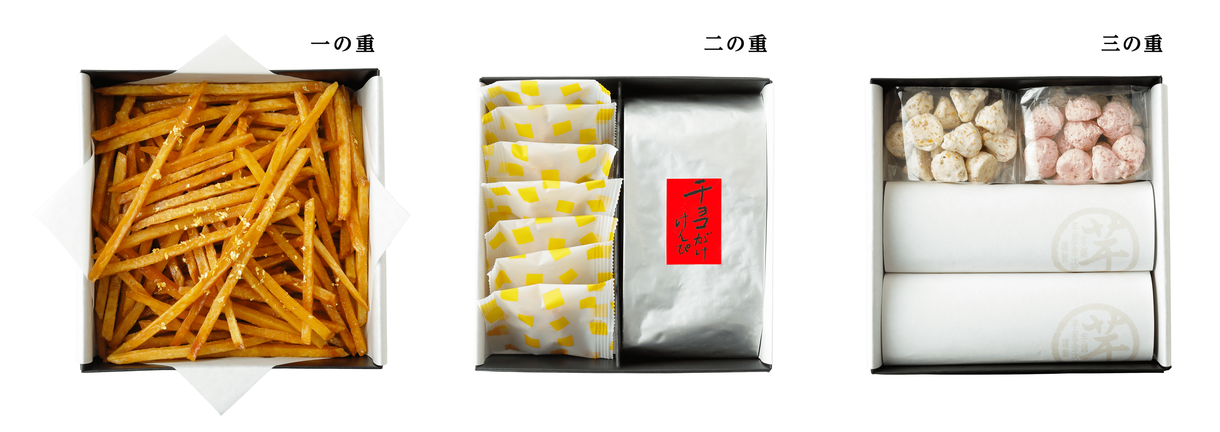 新年にふさわしい金次郎の祝菓子を三段に詰め合わせました。一段目には、贅沢に金粉をふってお召し上がりいただく、金次郎こだわりの特撰芋けんぴ。二段目には金次郎オリジナルのつぶけんぴとチョコがけけんぴ。そして三段目にはおめでたい紅白マカロンと、限定の焼酎パウンド、抹茶おぐらパウンドを贅沢に1本ずつ詰めました。