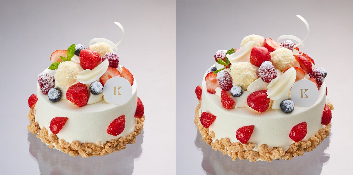 マスカルポーネ生クリームを絞り、イチゴやフランボワーズ、ブルーベリー、ホワイトチョコレート、スポンジで包んだ丸いチーズムースを飾りました。