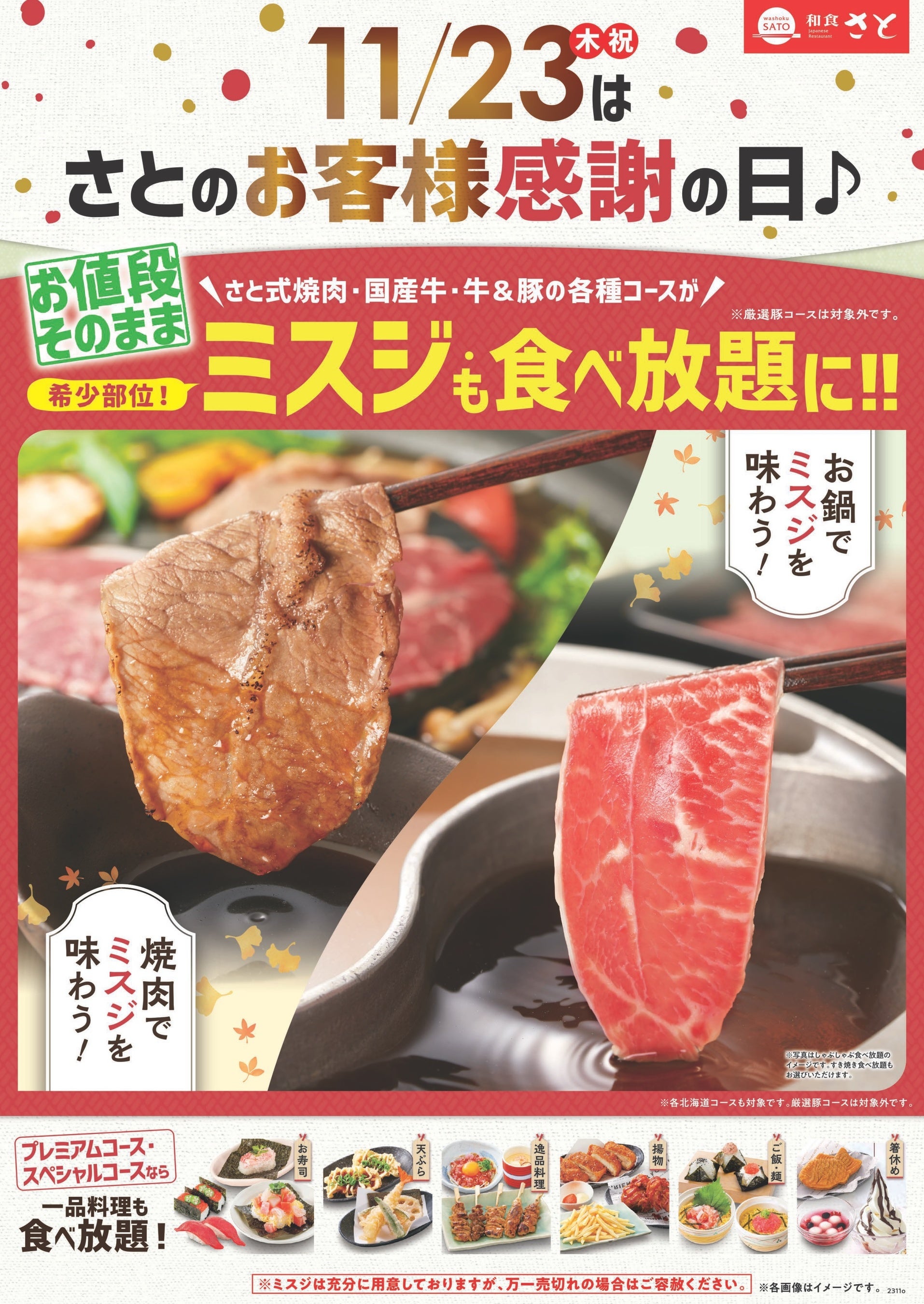 国内197店舗を展開する「和食さと」では、11月23日(木・祝)「勤労感謝の日」限定で、人気の焼肉/しゃぶしゃぶ/すき焼きの食べ放題コース「さと式焼肉/さとしゃぶ/さとすき」の特定コースで、牛肉の希少部位『ミスジ』も食べ放題になる『さとのお客様感謝の日』特別企画を開催します!!