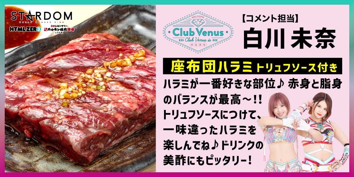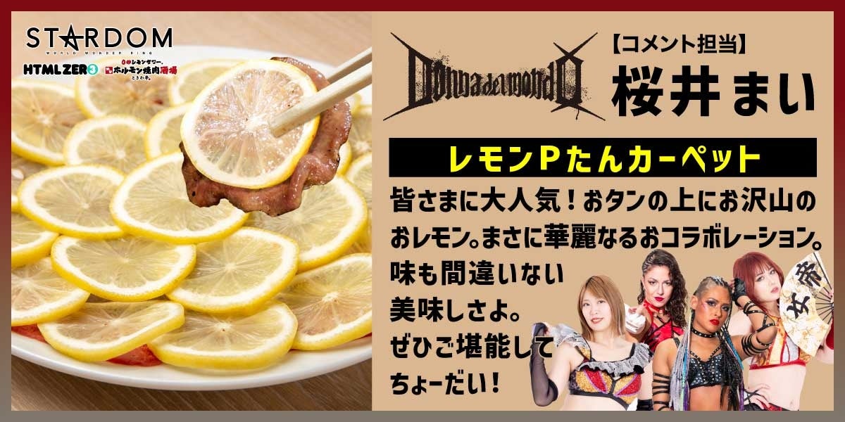 0秒レモンサワー®×スターダムのコラボ飲み放題は、「HTML ZERO3」のデザインによる「スターダム」の選手があしらわれたシロップでお楽しみいただけ、オリジナルデザインのマドラーをプレゼントいたします。また、「スターダム」の選手が選んだおすすめお肉メニューをご注文いただくと、「HTML ZERO3」デザインのオリジナル箸置きをプレゼントします。期間中は、店内に選手等身大パネルを設置しフォトスポットが登場。店内BGMも選手入場曲となりキャンペーンを盛り上げていきます。