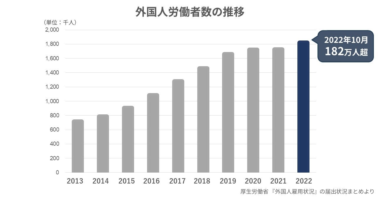 日本国内での外国人労働者は年々増え続けており、厚生労働省によると2022年10月時点で182万人(※)を超え、過去最多に上っています。
