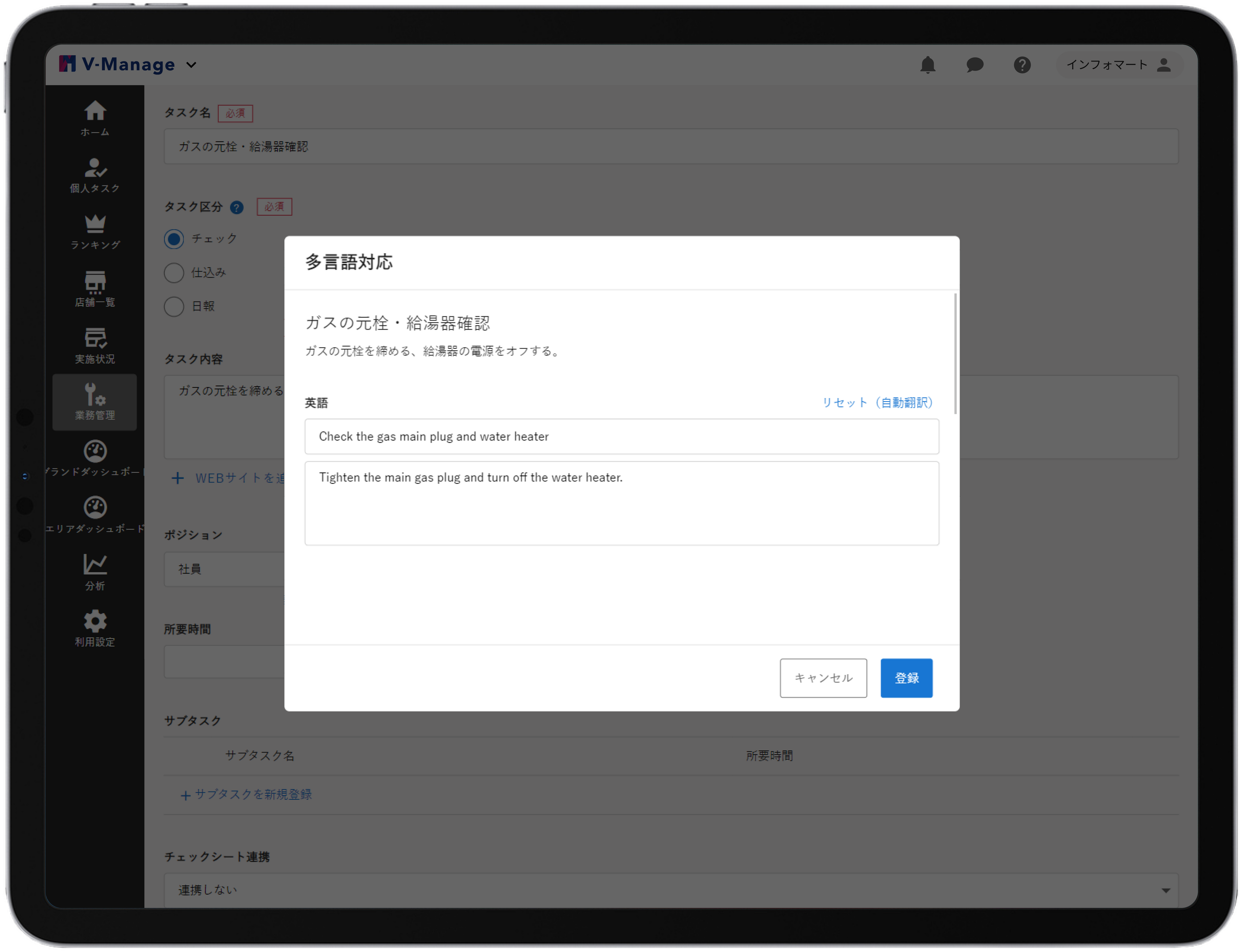 仕込みや清掃等のタスクを登録する際に、多言語の入力欄が表示されます。日本語で入力すると、自動で各言語に翻訳・テキスト入力され、登録することができます。(店舗でも同様にタスク登録可能)