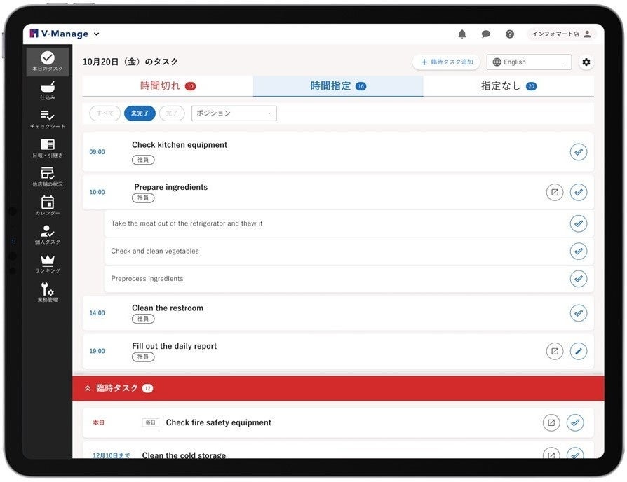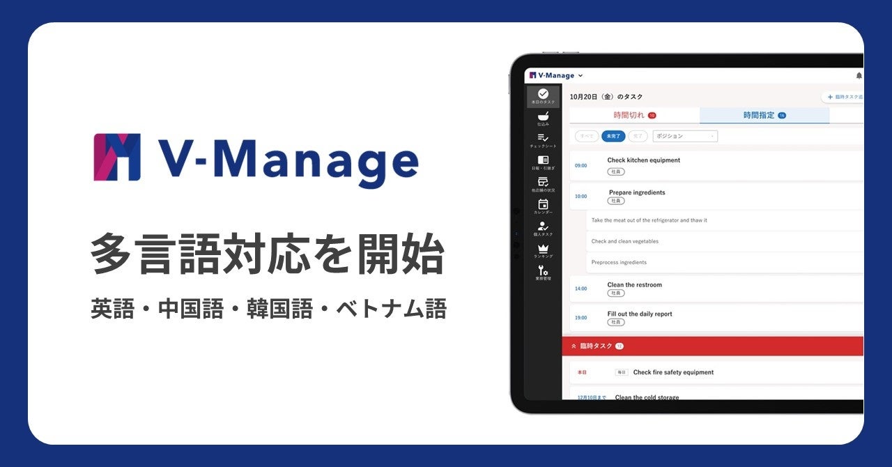 そこでこの度、飲食店のオペレーション効率化を推進する「V-Manage」に、多言語機能をリリースしました。日常的なタスクを管理する「本日のタスク」画面において英語・中国語・韓国語・ベトナム語に対応することで、外国人スタッフの教育時における翻訳等の時間を削減し、より効率的な店舗運営をサポートすることができます。これにより、店舗のサービス力・生産性の向上、働きやすい環境づくりに貢献します。
