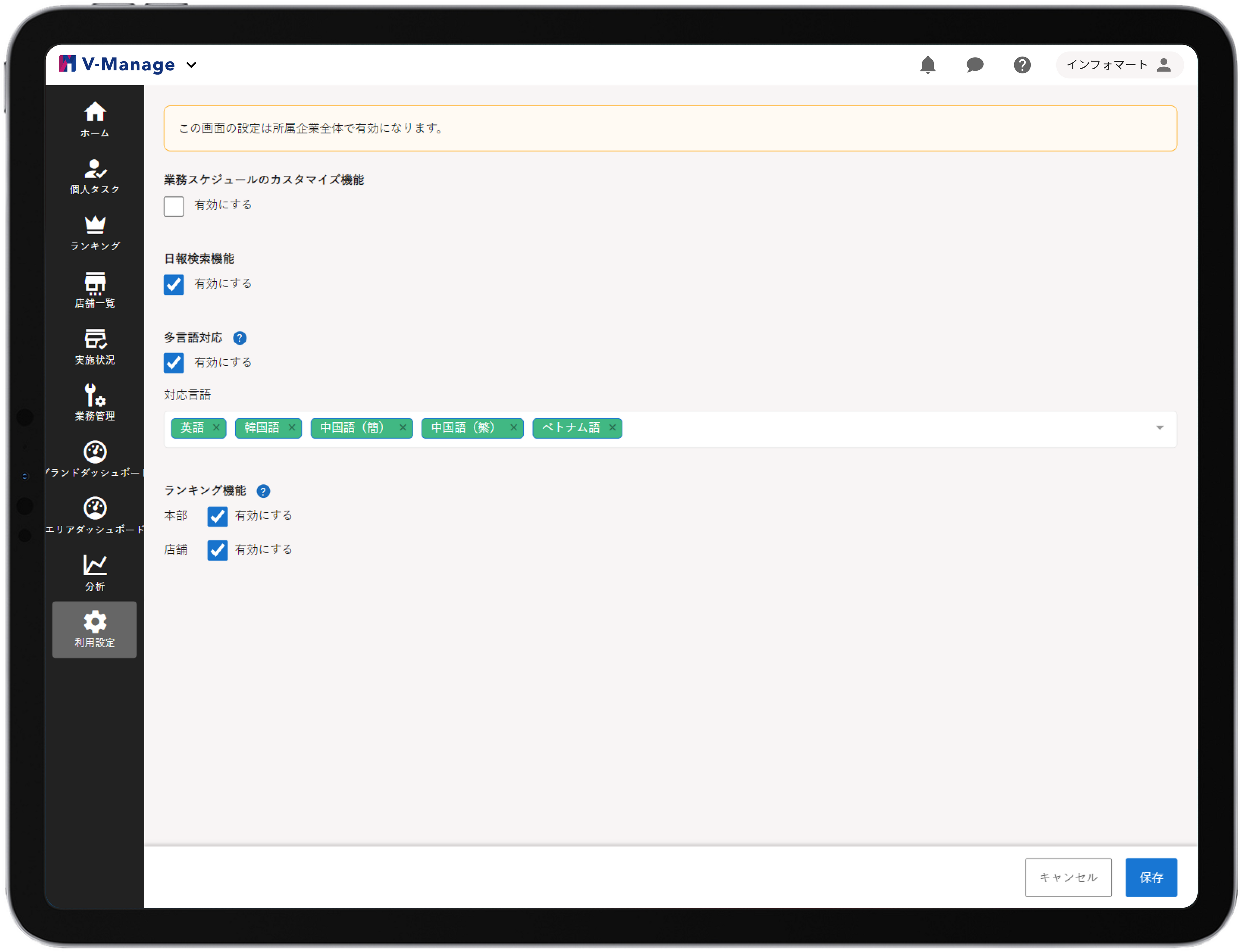店舗ごとに、多言語への対応を有効にするかどうかを設定することができます。