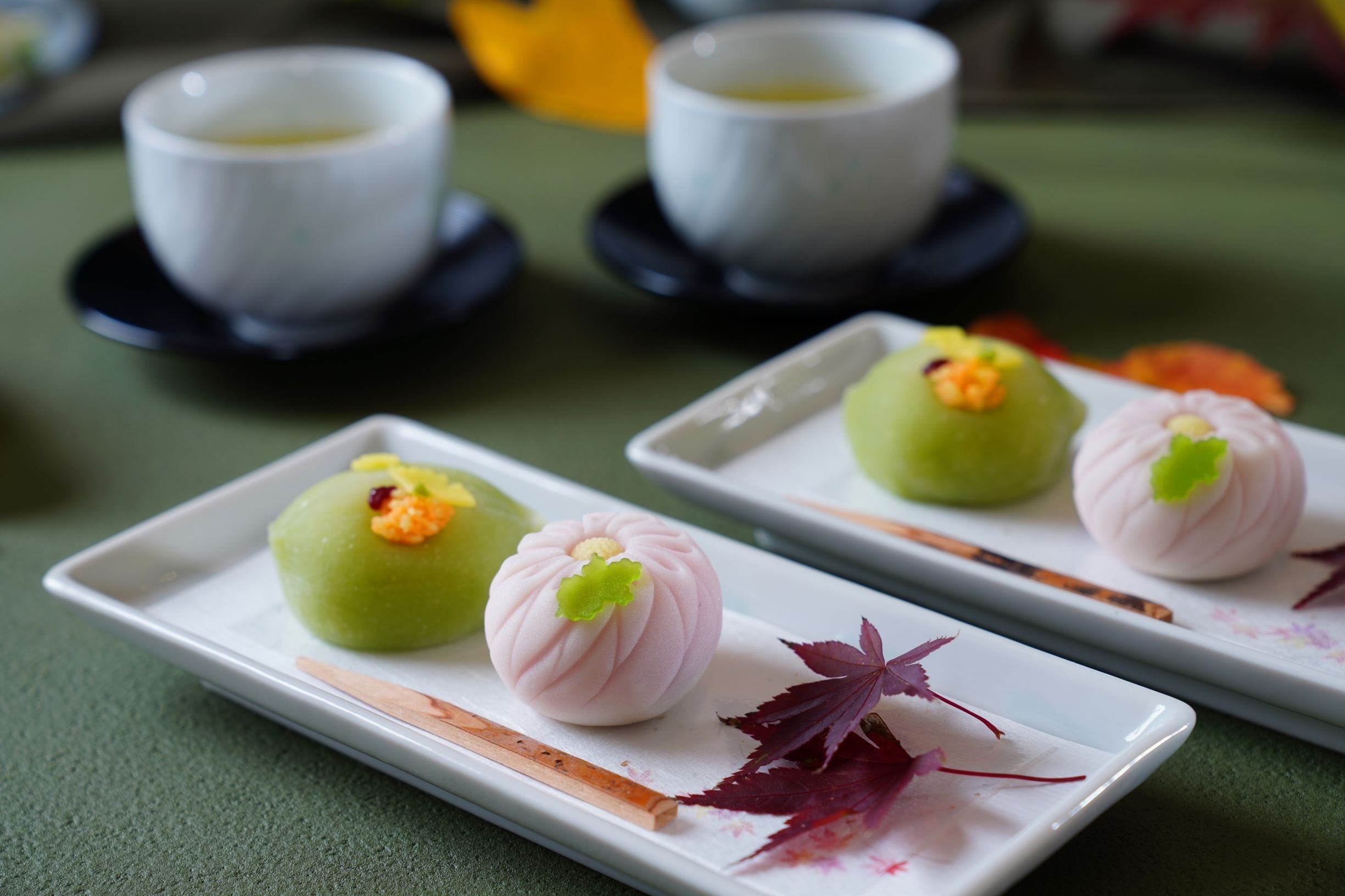 セイボリーは、松江の冬の食卓に欠かせない津田かぶの食感がポイントの「海老とアボカドと津田かぶのサラダ 抹茶風味」や、抹茶を練りこんだチーズテリーヌをドーム型に仕上げた「抹茶と栗のチーズドーム」などです。スイーツには、煎茶を炒って、牛乳に香ばしいかおりをうつした「煎茶のブランマンジェ」などをご用意いたします。松江市内の菓子老舗「桂月堂」の和菓子は、この企画だけのオリジナル「乱菊」「銀杏」の2種類を、煎茶とともにお召し上がりいただきます。