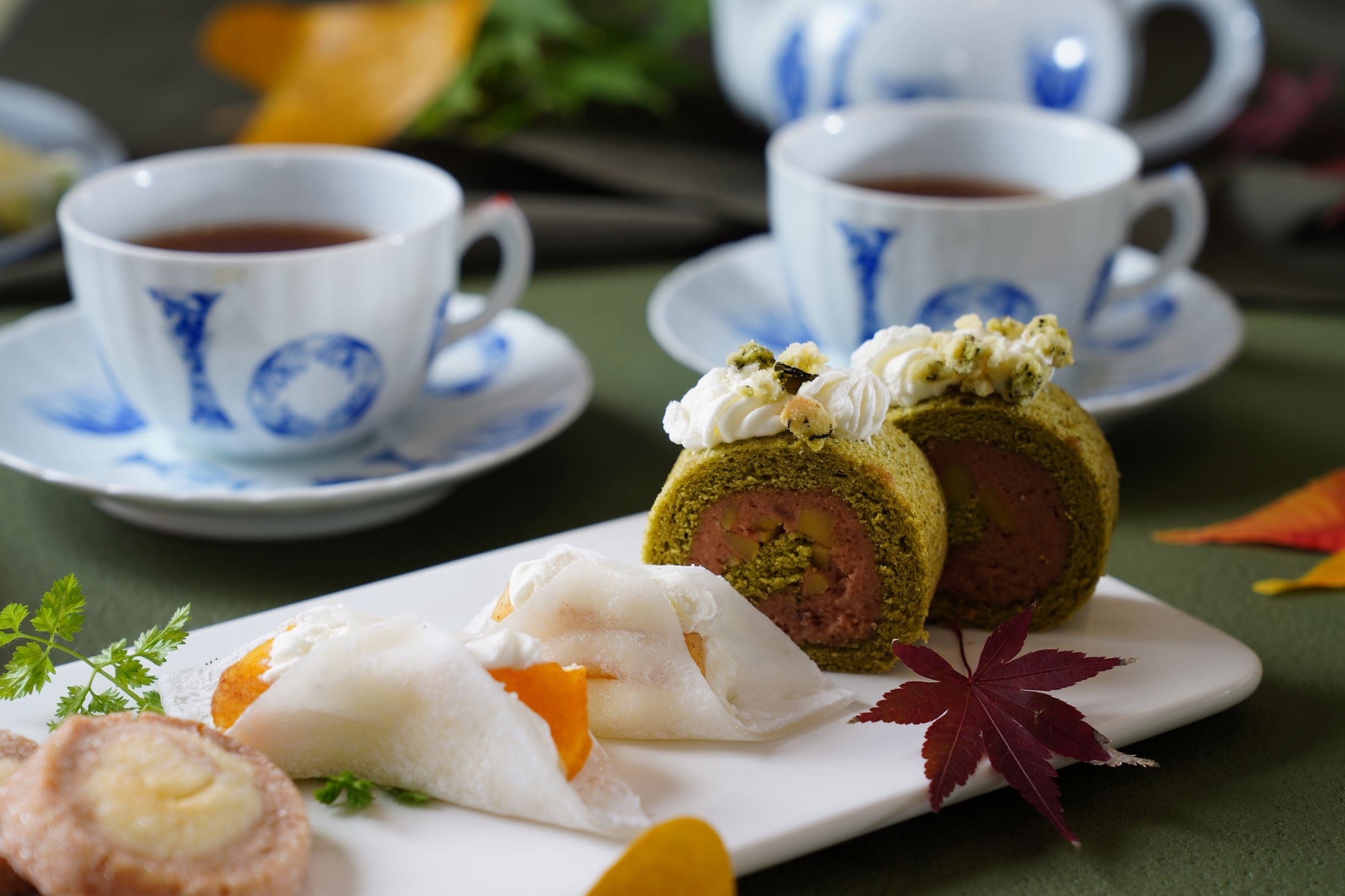・和菓子2種「乱菊」「銀杏」(桂月堂) ・煎茶のブランマンジェ ・栗と抹茶のロールケーキ