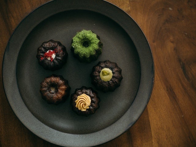 銅型と蜜蝋で焼いた人気店の本格カヌレ。トッピングだけでなく生地もそれぞれ味が違うこだわりよう。