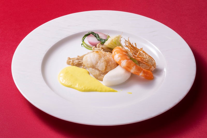 b.新潟県産アンコウのポワレ 天使の海老添え サフランソース