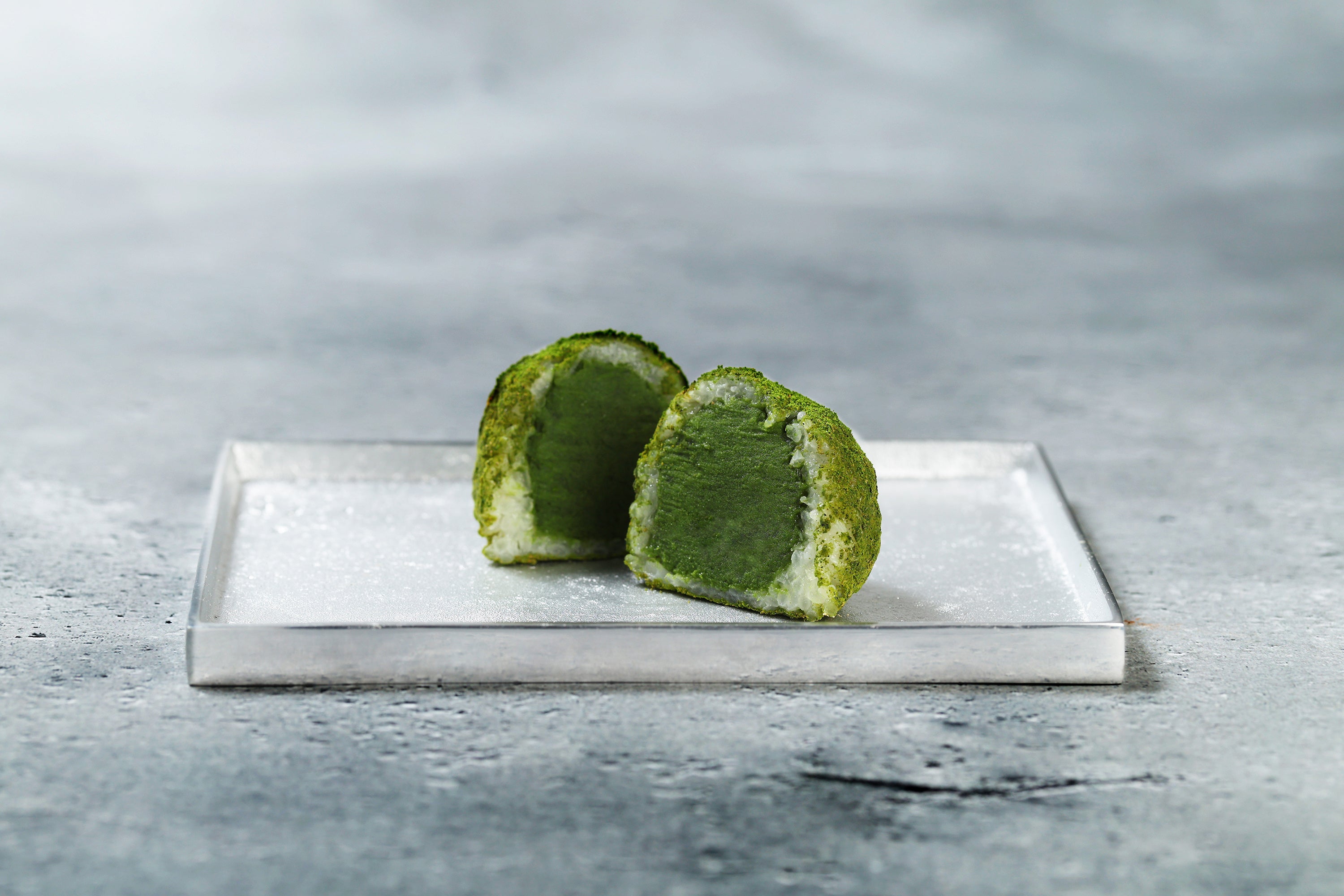 一番摘みの宇治抹茶のみを使用した抹茶おはぎ。餡には限界量を練りこみ、さらに周りにもたっぷりとまぶしています。