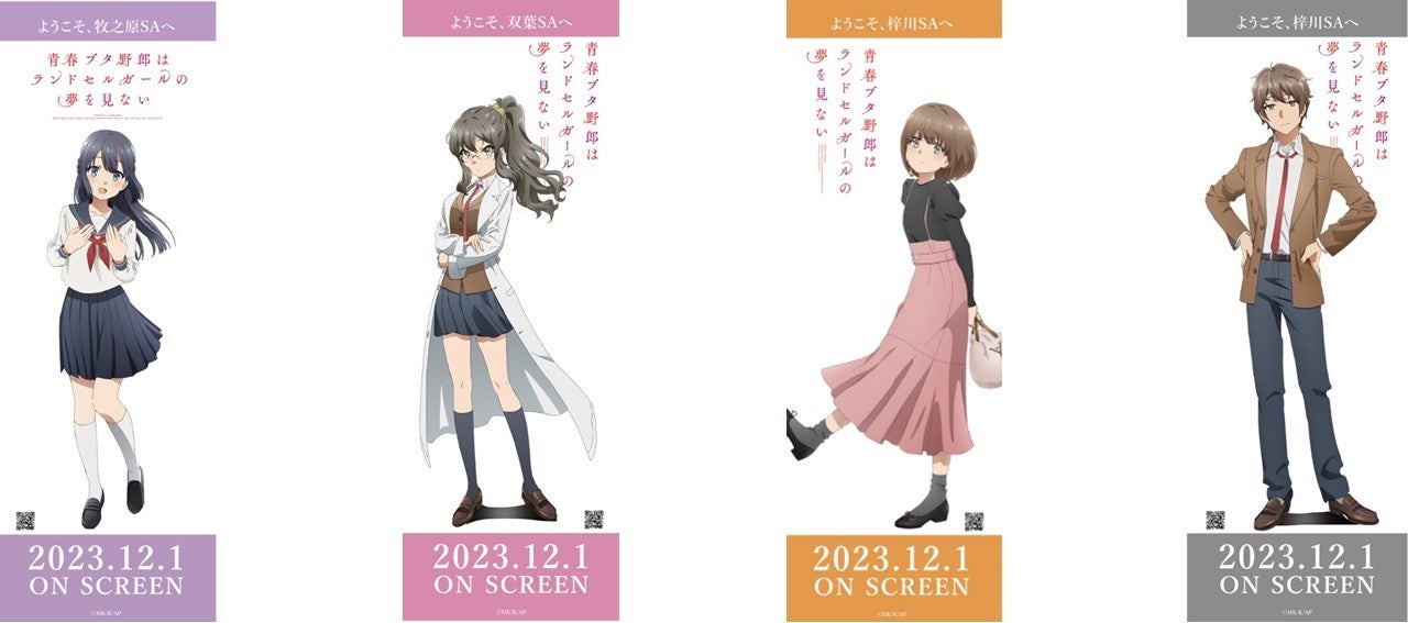 のぼり旗(画像はイメージです) ©2022 鴨志田 一/KADOKAWA/青ブタ Project (左から順に)牧之原SAバージョン、双葉SAバージョン、梓川SAバージョン ※梓川SAは左側が『梓川 花楓』、右側が『梓川 咲太』 |