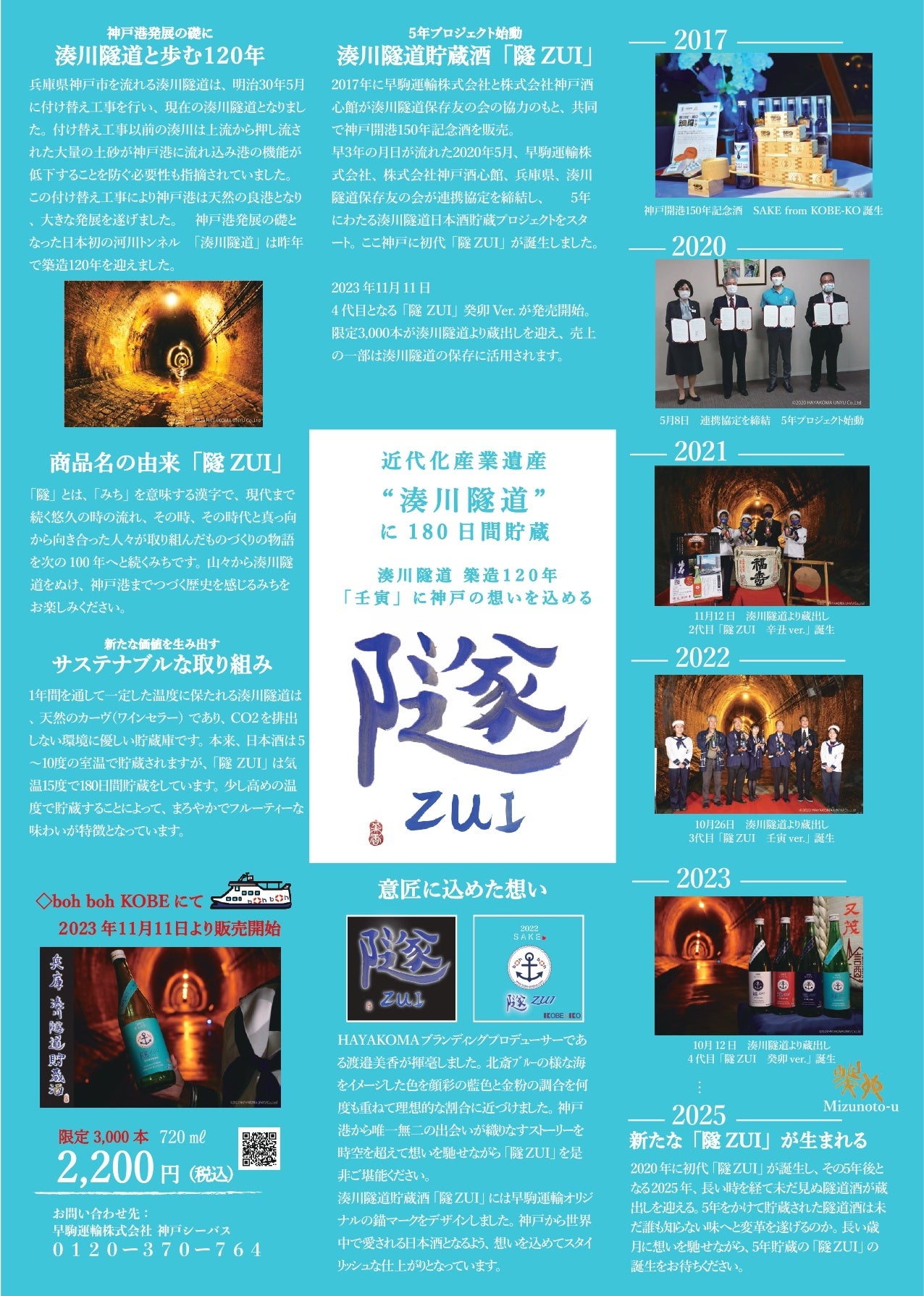 2017年、神戸開港150年を記念して、早駒運輸と神戸酒心館は、湊川隧道保存友の会と連携し、記念酒「SAKE from KOBE-KO」を販売しました。そして、2020年より五国兵庫の歴史文化を再発信するため、新たに兵庫県も参画した4者によって5 年間にわたる日本初の『湊川隧道 日本酒貯蔵プロジェクト』がスタートし、兵庫湊川隧道貯蔵酒「隧 ZUI」が誕生しました。