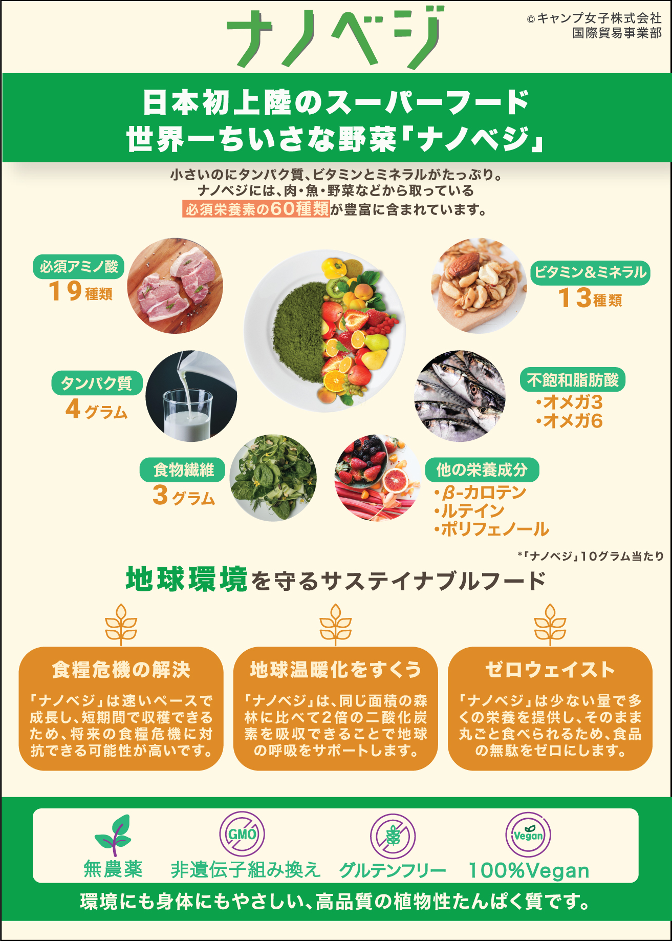 「ナノベジ」は豊富なタンパク質を含む野菜(藻)で、植物性プロテインです。不規則になりがちな学生の皆様の食生活を、スプーン1杯で健康を届けます。