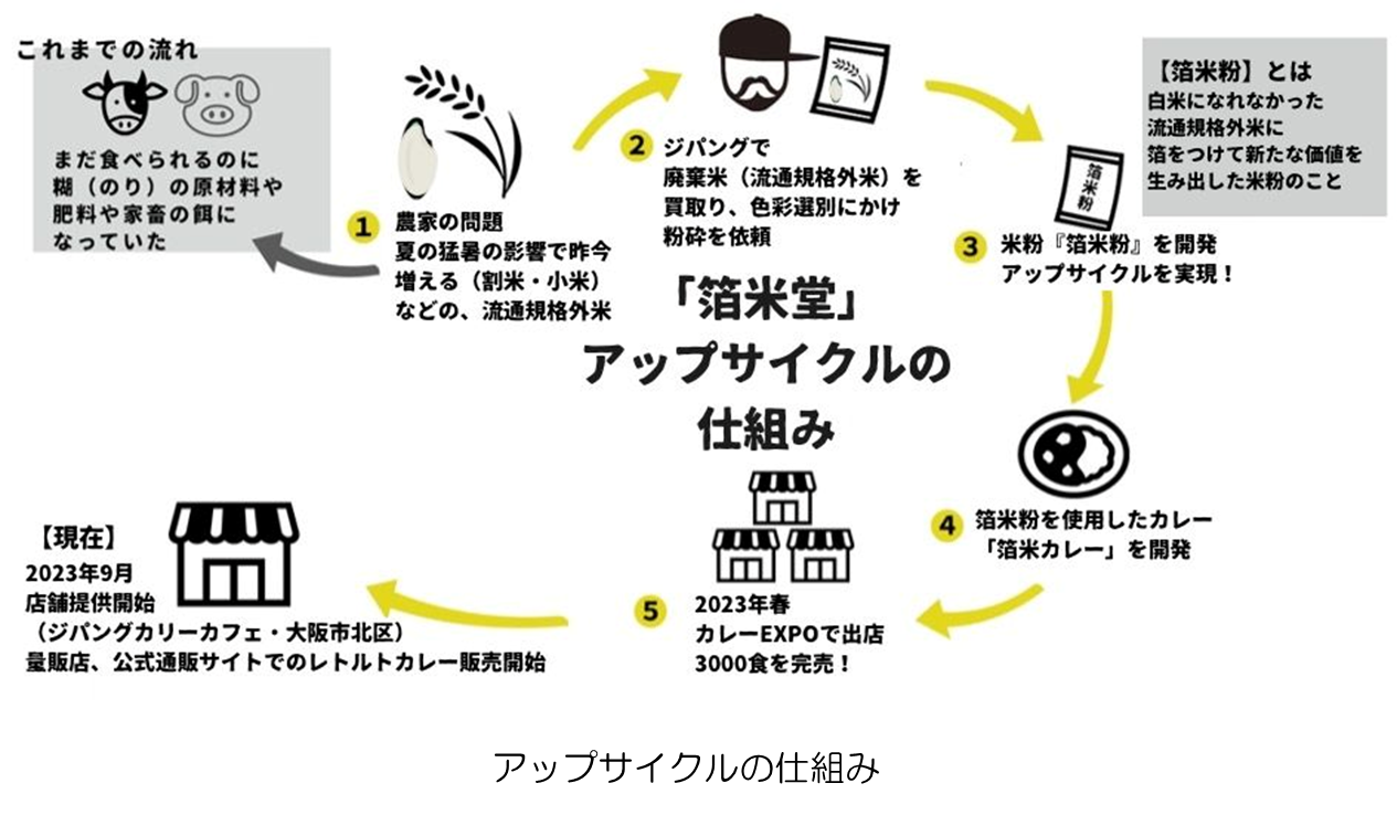 「箔米堂」は「箔米プロジェクト」から生まれた商品を世の中に届けるために始動した新しいSDGsブランドです。現在、日本全体で年間 646 万トンを越える食品ロスが問題となっています。(平成27年度消費者庁調べ) 廃棄される食材のうち、多くの割合を占めるのは「米」である。昨今の夏の猛暑の影響は、世界の問題になり続ける、流通される事のない米は30キロ30円などで、米農家から引取り業者に叩き買いされて、肥料や飼料になっている現実がある事を知った。そんな白米になれなかった流通価値のないお米に、箔をつけ米粉に変え、価値あるものに変換(アップサイクル)することで、生産者、飲食店の役に立ち、問題解決に向け社会に貢献できるのではないかと想い「箔米プロジェクト」を発足。プロジェクトから生まれた商品を展開する「箔米堂」 として、新ブランドを立ち上げました。