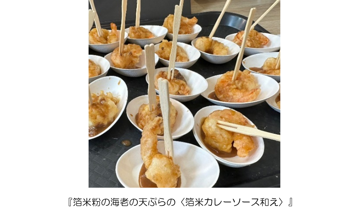 オーストラリアのメルボルンで開かれた『Osaka Food Business Showcase & B to B Meetings in Melbourne 主催 IBPC大阪』で『箔米粉』と『箔米カレー』のコラボメニュー『箔米粉の海老の天ぷらの〈箔米カレーソース和え〉』を提供しました。特徴としては天ぷらの粉には小麦粉ではなく、箔米粉を使用。オカキのように冷めても美味しいサクサク感が持続させ、海老の風味を閉じ込め提供することができました。さらに、鰹と昆布の和出汁ベースの箔米カレーをソースに使用することで、和出汁の香りがふんだんに味わえる商品が完成。海外のゲストにも喜んで、楽しんでいただけました。