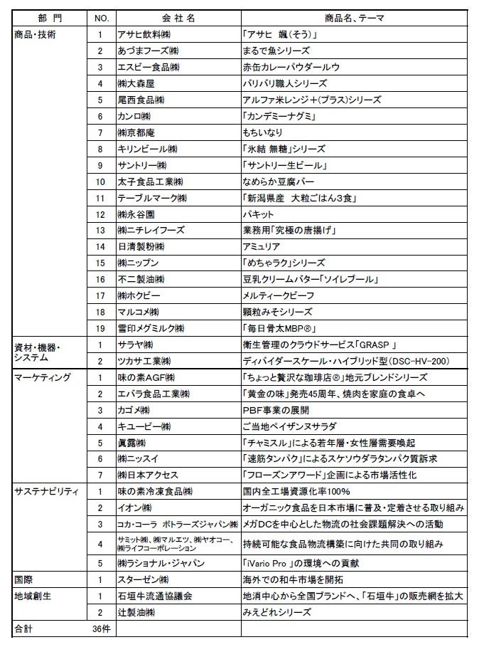 今年は、独自技術を背景にしたヒット商品やサービスなど、6部門36件の商品及びテーマが受賞しました。部門別の内訳は「商品・技術部門」19件、「資材・機器・システム部門」2件、「マーケティング部門」7件、「サステナビリティ部門」5件、「国際部門」1件、「地域創生部門」2件となりました。