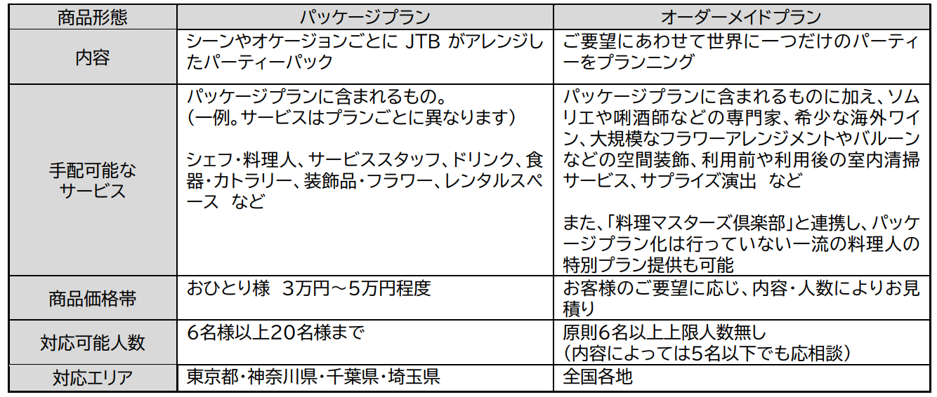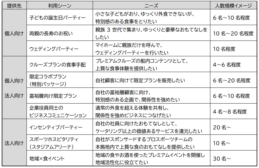 リビングオーベルジュは、JTBの新規事業公募制度「JUMP!!!」(※2)にて、子育て中の社員から発案されたアイデアで、「子どもが小さいときに、特に高級店での外食ができなかったり、しにくかったりした」という経験から、同じような悩みを持つお客様の課題を解決したいと考えたことがきっかけとなりました。同時に、人材不足や材料費高騰などの課題が顕在化する飲食産業に対しても、店舗外での効率的な売り上げ創出や、これまで店舗を認知していなかったお客様の掘り起こし、店舗のブランド価値向上など、飲食事業者とJTBが共創していくことを目指しています。2022年4月以降、一般社団法人日本ホームパーティー協会などの外部パートナーと連携してサービス開発に着手し、2023年7月~9月に行った実証実験の成果を踏まえ、新規事業として販売開始に至りました。